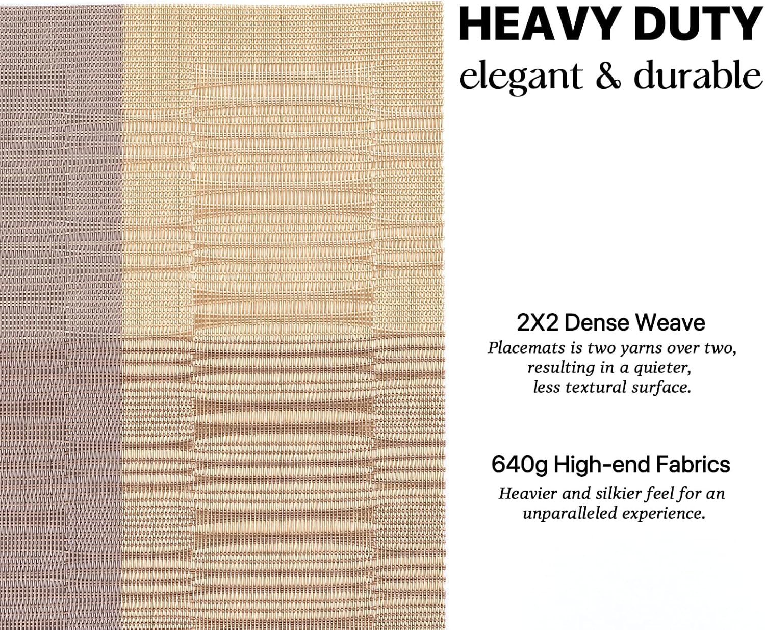 • HEAVY-DUTY:We uses the German-imported higher grammage vinyl material (Specialty PVC)than other placemats on the market,plus the precise,dense weave craftsmanship to give the woven placemats a thicker feel and make the place mats long-lasting.