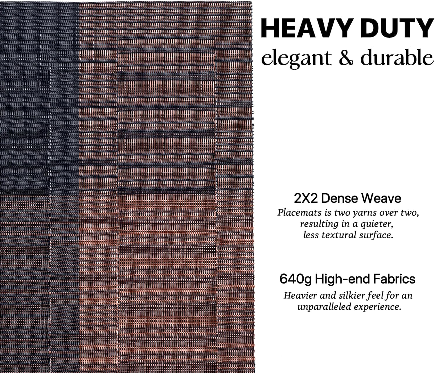 • HEAVY-DUTY:We uses the German-imported higher grammage vinyl material (Specialty PVC)than other placemats on the market,plus the precise,dense weave craftsmanship to give the woven placemats a thicker feel and make the place mats long-lasting.
