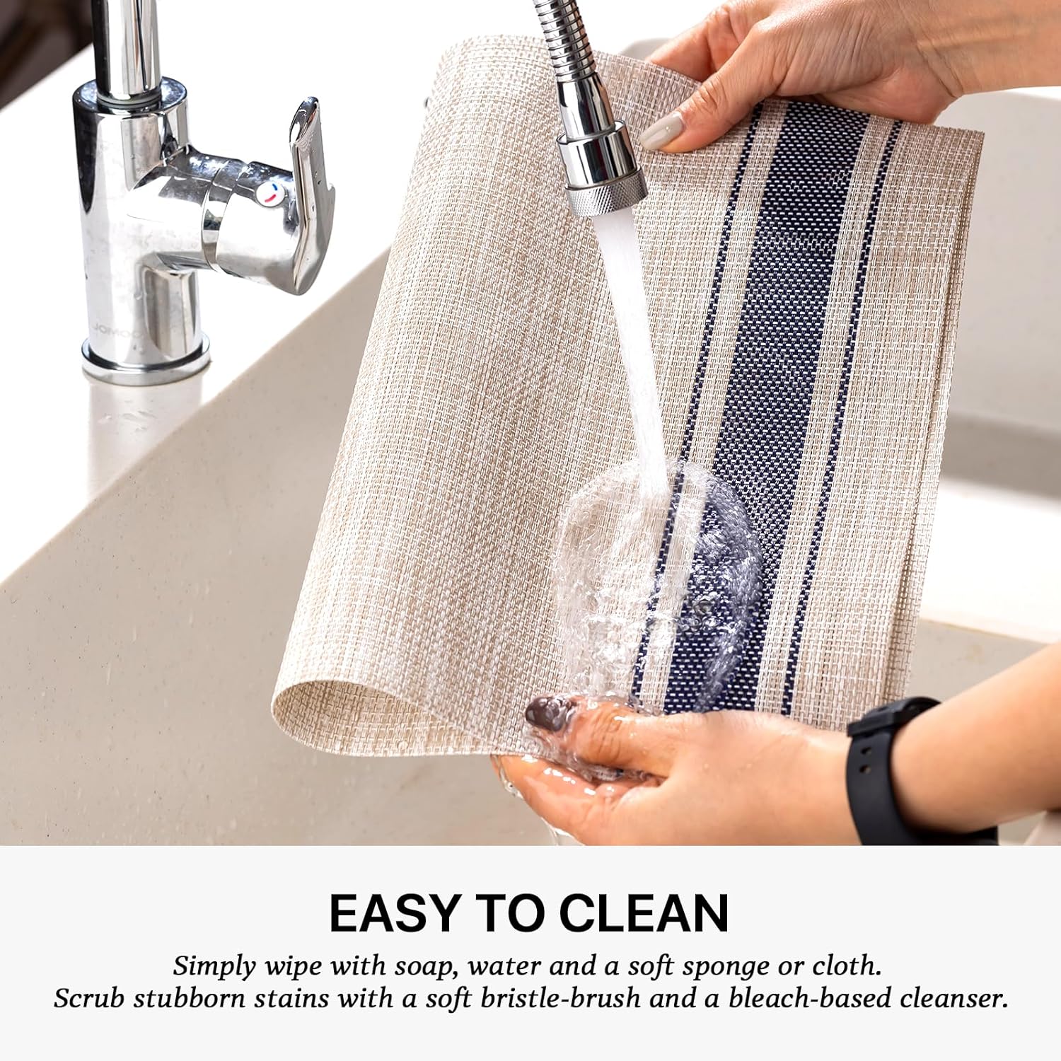 • EASY TO CLEAN:The washable placemats can be washed repeatedly.How to clean the place mats for kitchen table:Simply wipe with soap,water and a soft sponge or cloth.Scrub stubborn stains with a soft bristle-brush and a bleach-based cleanse.