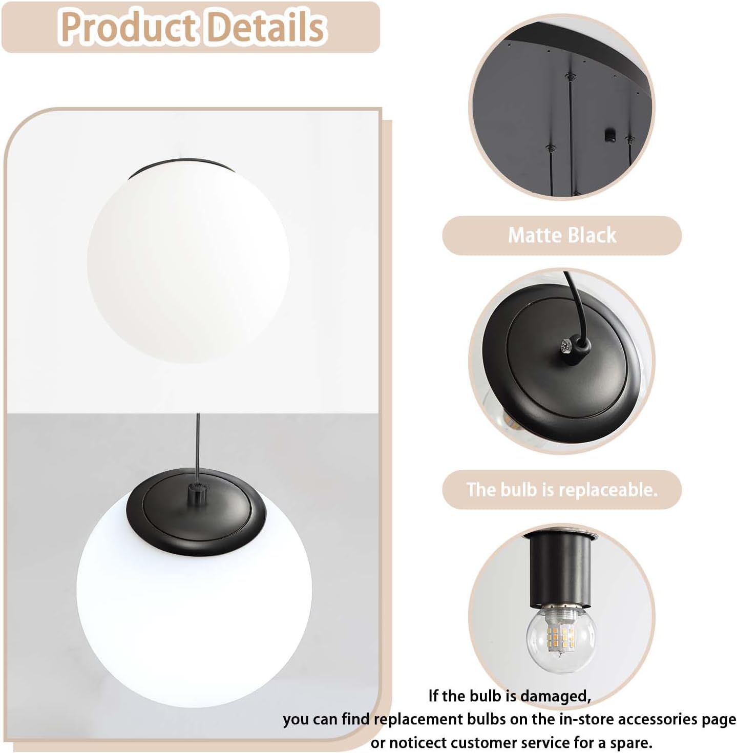 • Classic Globe pendant light feature:Made of metal and glass(matte black metal+white glass).The black circular ceiling pan diamater is 20",Glass lamp shade diameter: 5.9 "(15cm). Pendant Light has a total length of 138". Adjustable cord ,You can choose the suitable height for your space.