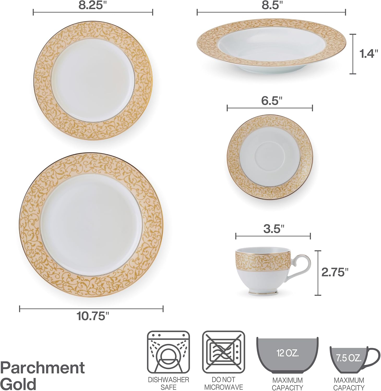 • TIMELESS ELEGANCE: each piece in the Parchment Gold dinnerware collection is adorned with an upscale golden scroll design