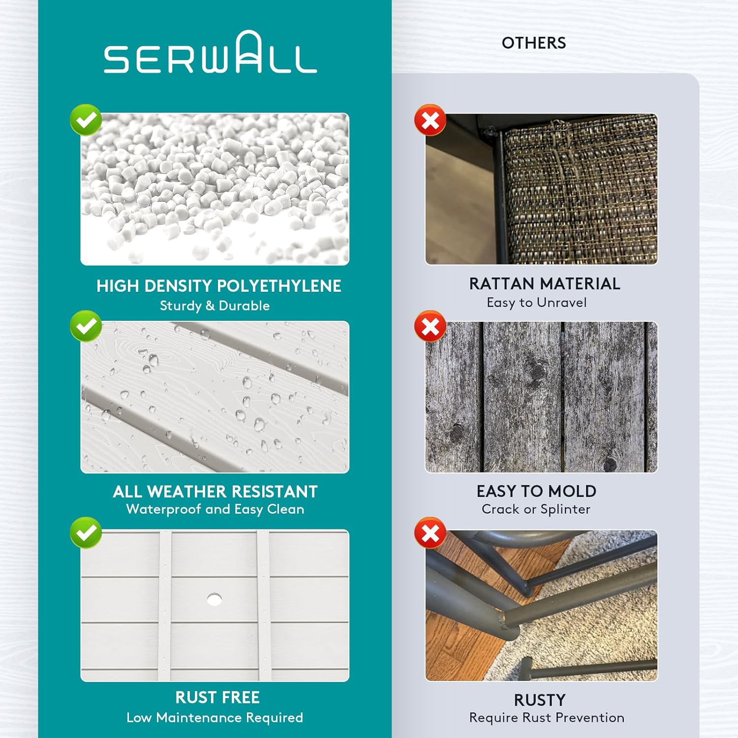 - 【Low Maintenance】HDPE dining table sets required low maintenance. Unlike the Steel dining sets may require rust prevention, SERWALL patio dining table and chairs are easy to clean with just soap and water, requiring minimal effort to keep them looking fresh.