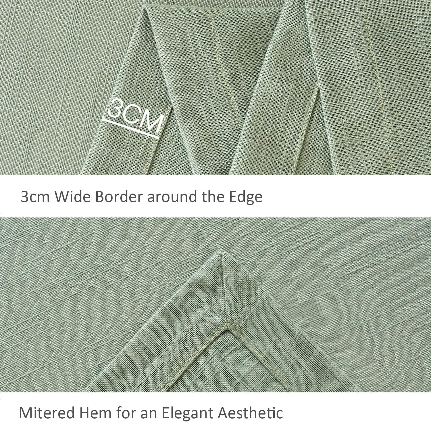 • Our table cloths are made of high quality polyester faux linen yarn, with slubby texture. It is more durable than real linen yet soft and supple; while protecting table surface, our tablecloth also adds a sense of understated luxury to your dining scene.