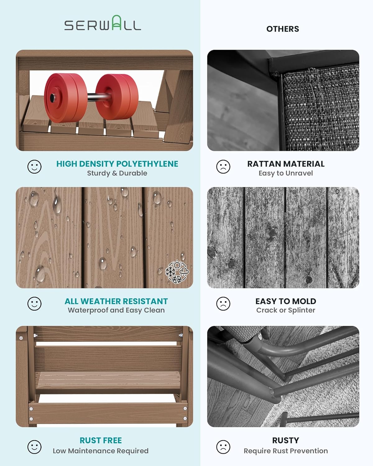 - 【Low Maintenance】HDPE dining table sets required low maintenance. Unlike the Steel dining sets may require rust prevention, SERWALL patio dining table and chairs are easy to clean with just soap and water, requiring minimal effort to keep them looking fresh.
