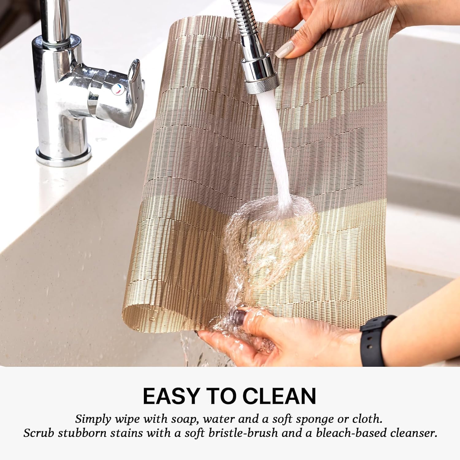 • EASY TO CLEAN:The washable placemats can be washed repeatedly.How to clean the place mats for kitchen table:Simply wipe with soap,water and a soft sponge or cloth.Scrub stubborn stains with a soft bristle-brush and a bleach-based cleanse.
