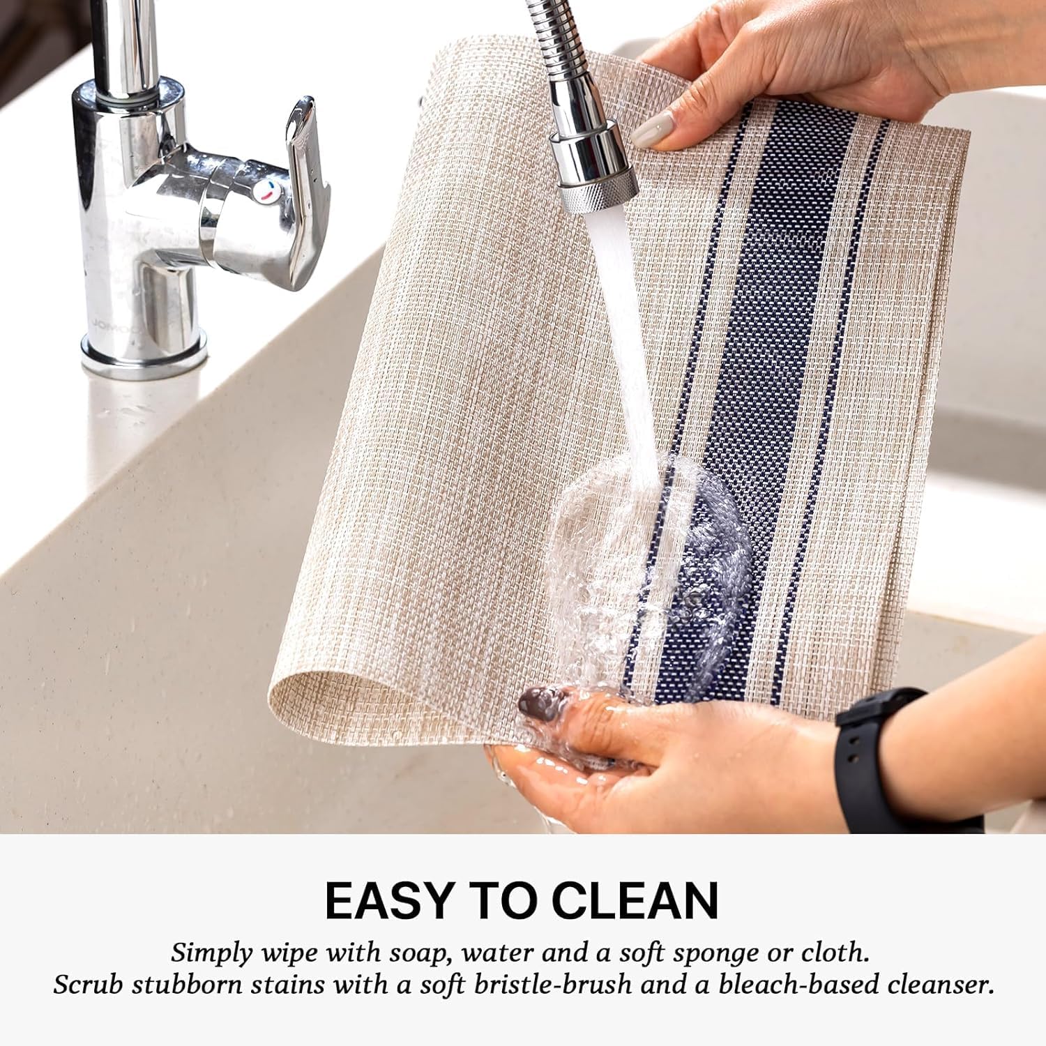 • EASY TO CLEAN:The washable placemats can be washed repeatedly.How to clean the place mats for kitchen table:Simply wipe with soap,water and a soft sponge or cloth.Scrub stubborn stains with a soft bristle-brush and a bleach-based cleanse.