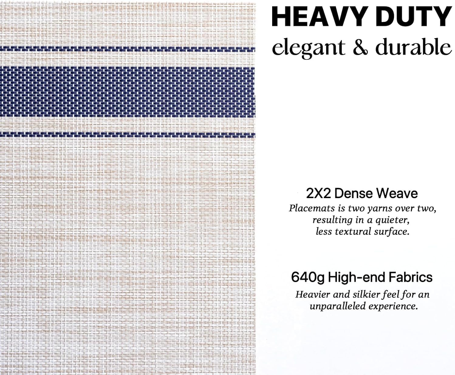 • HEAVY-DUTY:We uses the German-imported higher grammage vinyl material (Specialty PVC)than other placemats on the market,plus the precise,dense weave craftsmanship to give the woven placemats a thicker feel and make the place mats long-lasting.