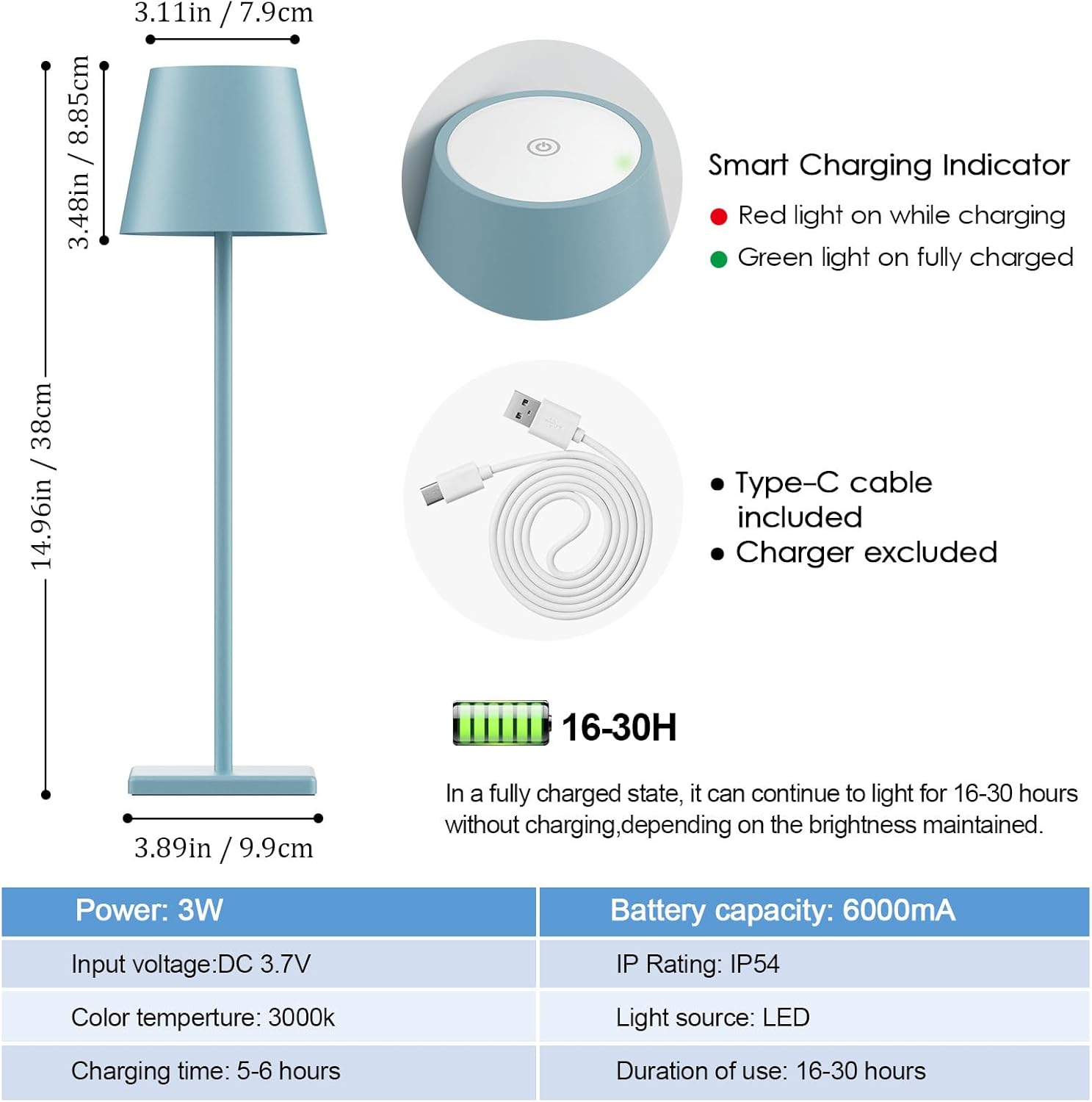 • 【Aluminum Metal Table Lamp】 High capacity battery, Type-C charging port, 5-6 hours of charging, 16-30 hours of use; Power 3W; Input voltage: 3.7V; High quality metal aluminum + acrylic lampshade; Size 4.37LxH 15.2 inches; Push button switch control; IP65 waterproof, can be used outdoors.