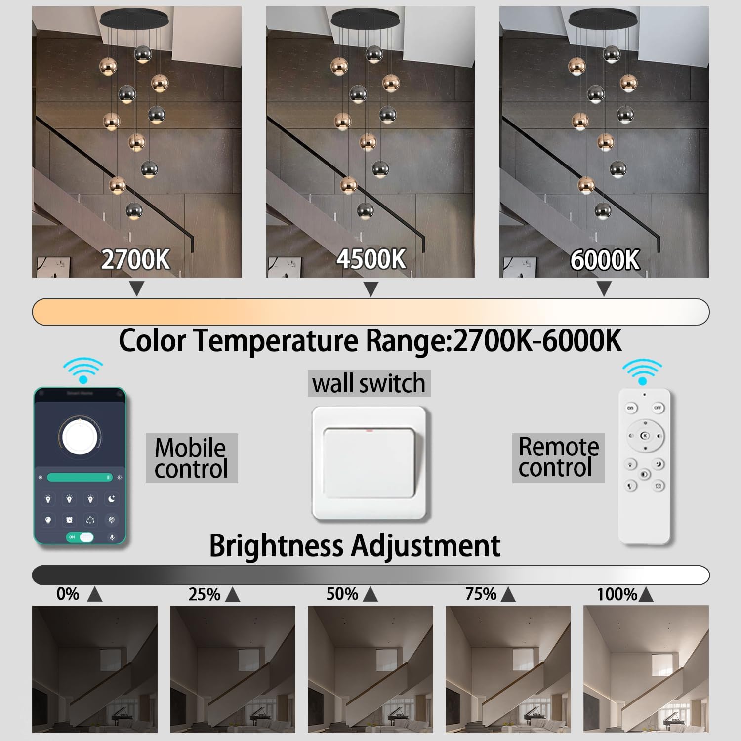 • 【Adjustable Height and Moulding】The length of the stairwell drop chandelier ceiling cable and the position of the crystal ball are completely up to you. The maximum length of the cable is 110inches. The canopy is 20 inches (50 cm) in diameter.Sphere size:2.4"x4". AC 85V-256V,8000Lumens. Total 80W LED and Remote control(6000K White/4500K warm white/2700K warm light