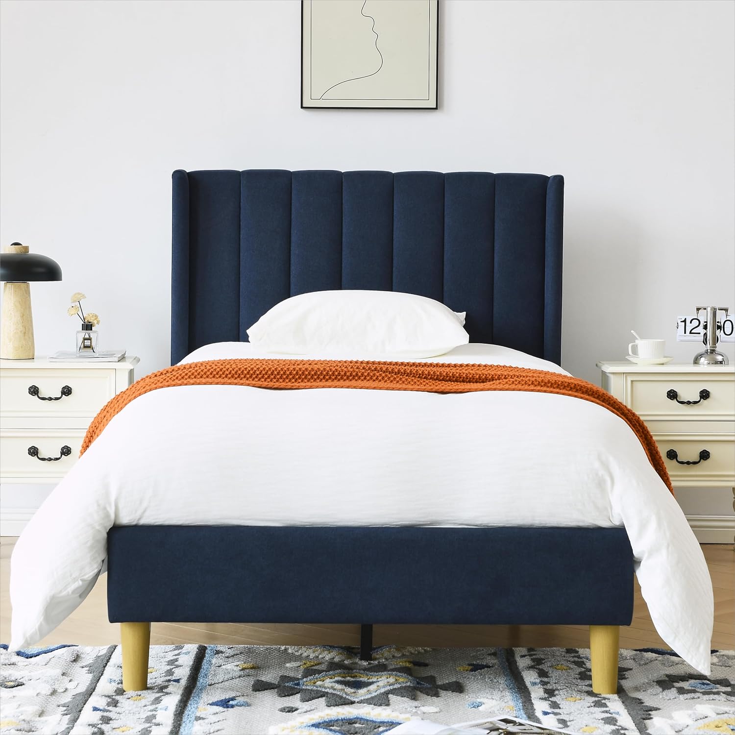 YUHUASHI upholstered Platform Bed Frame/Twin Bed Frame/Modern Geometric Double-Wing Design headboard/Linen Fabric/Easy to Assemble no Noise (Navy Blue, Twin)