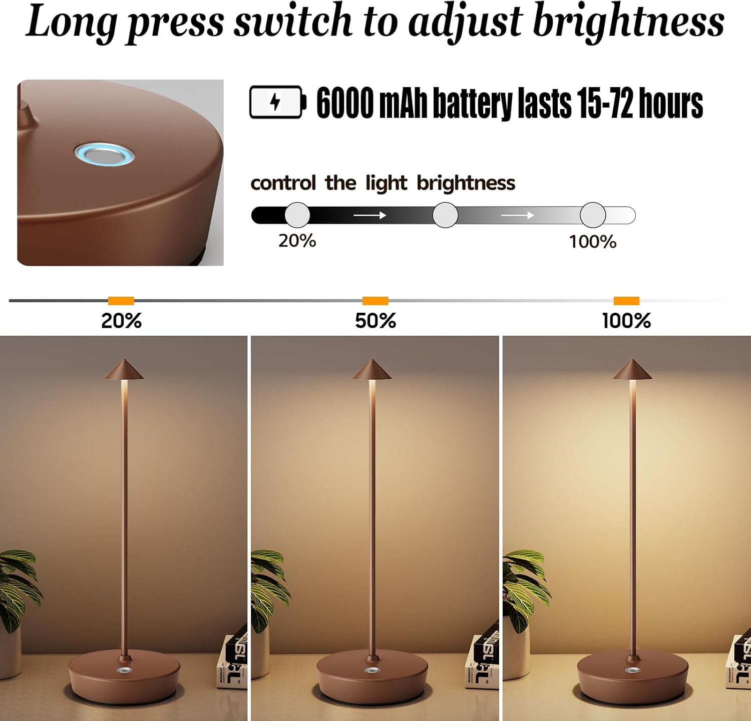 • 【Extended Battery Life】Say goodbye to constantly charging your desk lamp. With its powerful 6000mAh battery, our Cordless lamp can provide illumination for up to 15-72 hours, depending on the brightness level. Enjoy uninterrupted productivity or relaxation without the hassle of tangled cords.