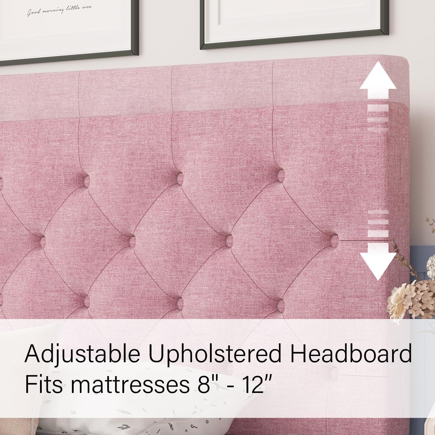 HOMBCK Full Bed Frame with Headboard, Linen Fabric Upholstered Bed Frame Full, Pink Bed Frame with Wood Slats, Button Tufted, No Box Spring Needed, Pink