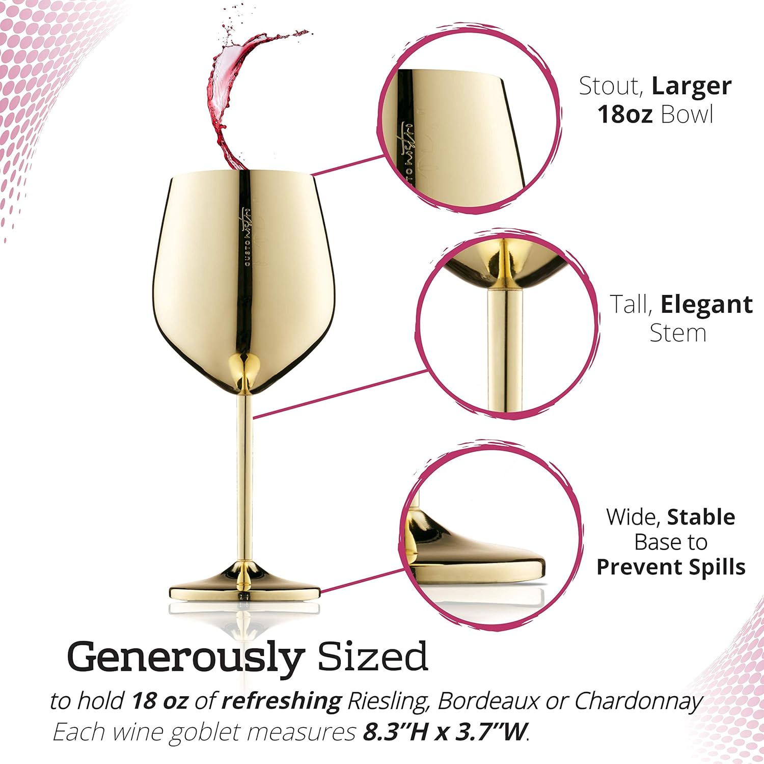 • HIGHLY-POLISHED 304 stainless steel creates unbreakable wine glasses that are perfect for outdoor use around swimming pools and beaches where traditional glassware is prohibited. Each wine goblet measures 8.3”H x 3.7”W.