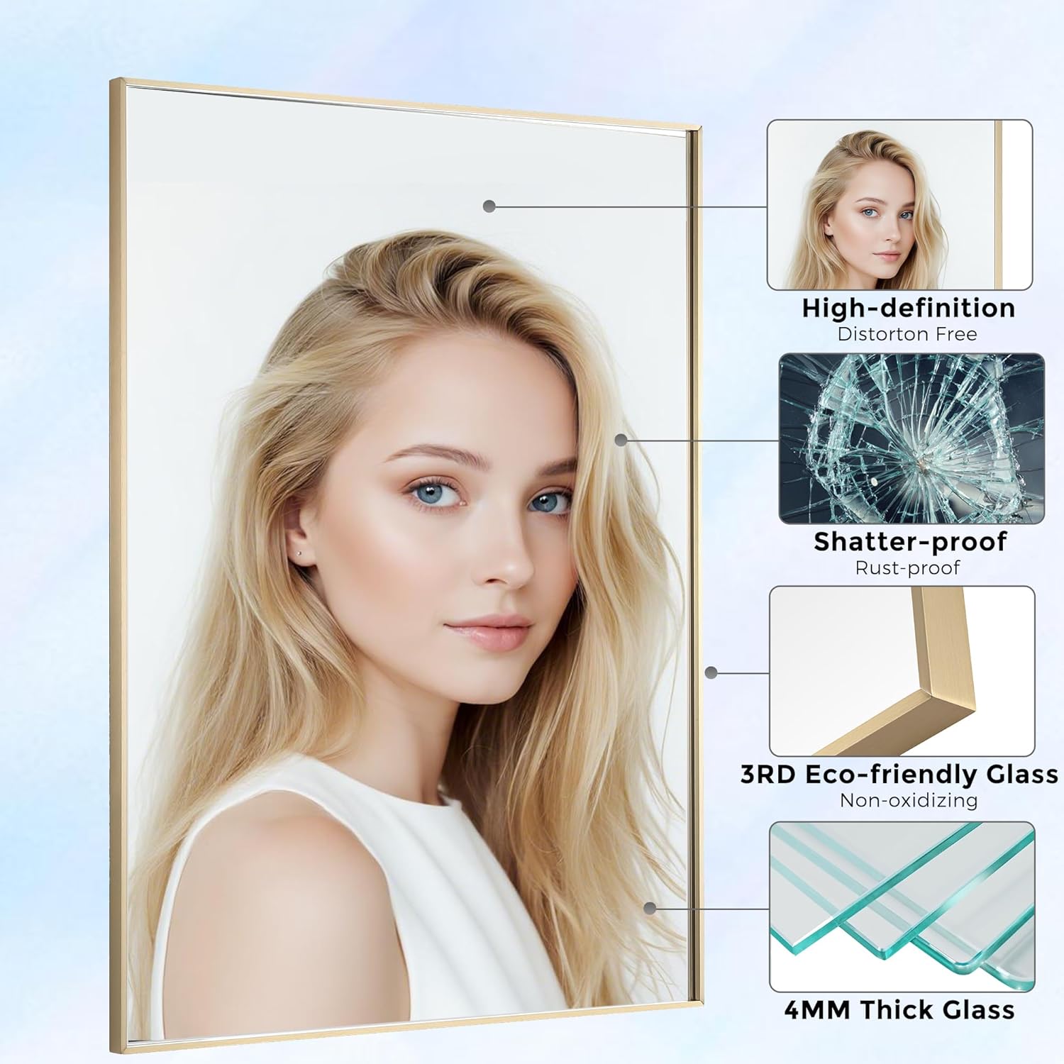 27x36 Inch Brass Bathroom Mirror for Wall, Aluminum Frame Rectangle Rectangular Vanity Mirror, Modern Large for Bedroom, Living Room, Horizontal or Vertical