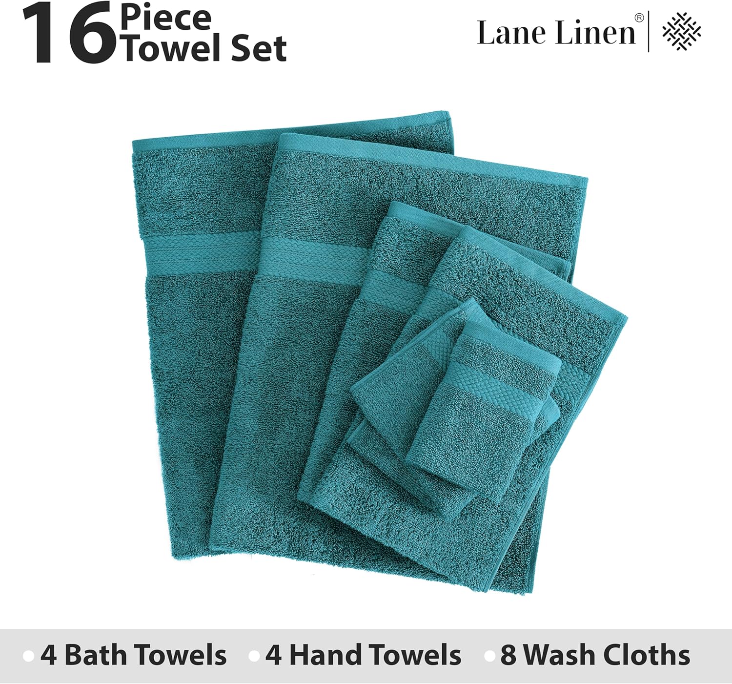 LANE LINEN 100% Cotton Luxury Bath Towel Set - 16 Pieces - Ring Spun, Quick Dry, Highly Soft & Absorbent - 4 Bath Towels, 8 Washcloths, 4 Hand Towels for Bathroom - Sustainably Produced - Sea Port