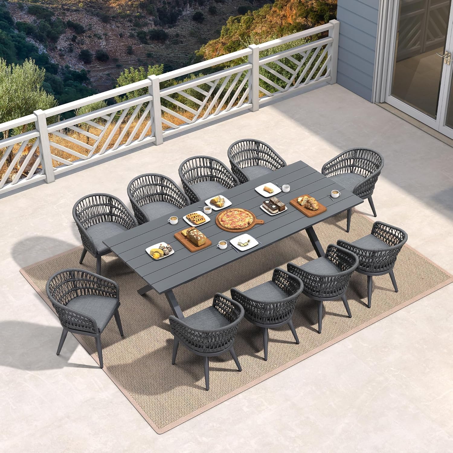 • All-weather Patio Furniture Set: Includes 1 rectangular grey table (98.42"L x 38.58"W x 29.13"H) and 10 grey chairs (19.29"W x 19.29"D x 29.52"H, 15.35"SH).