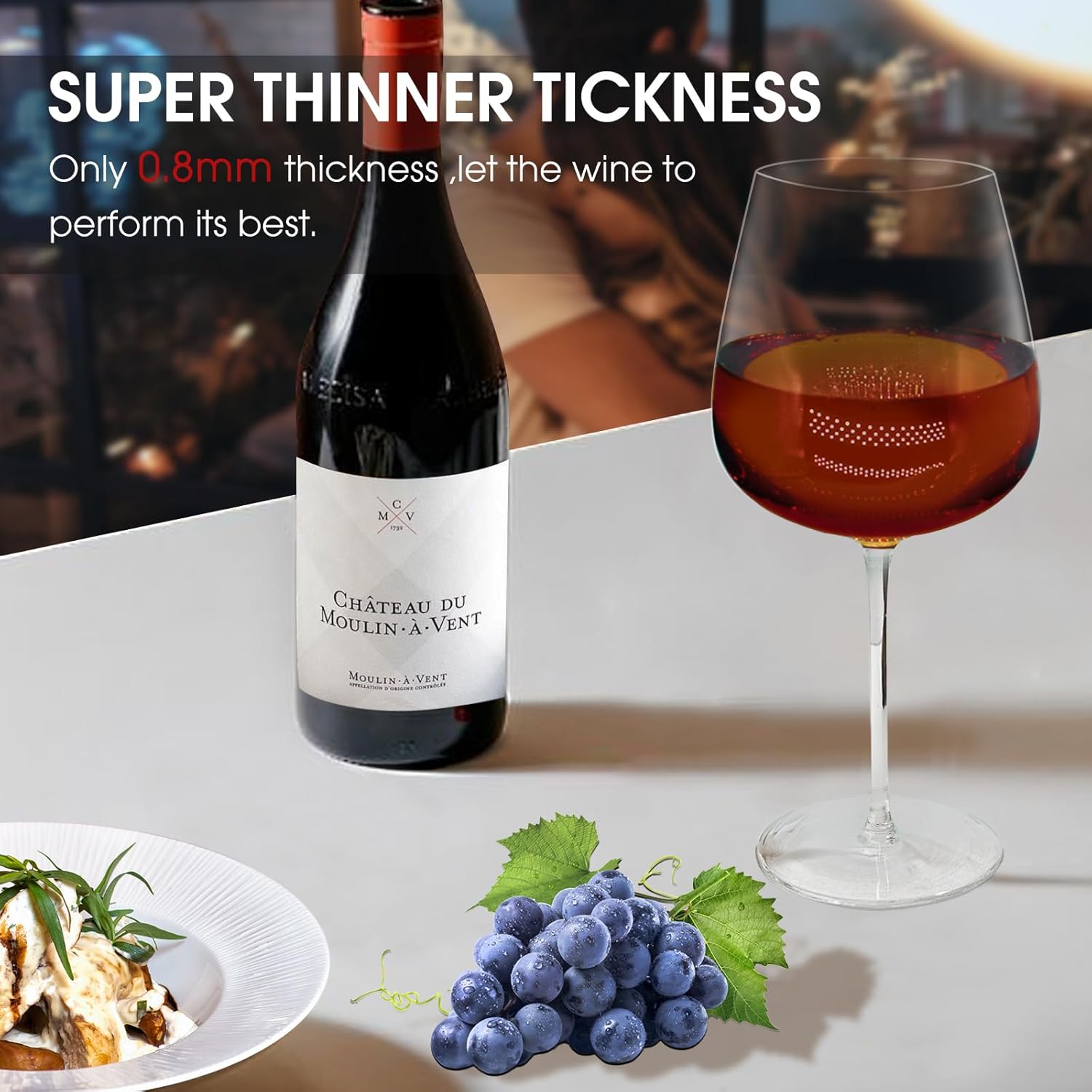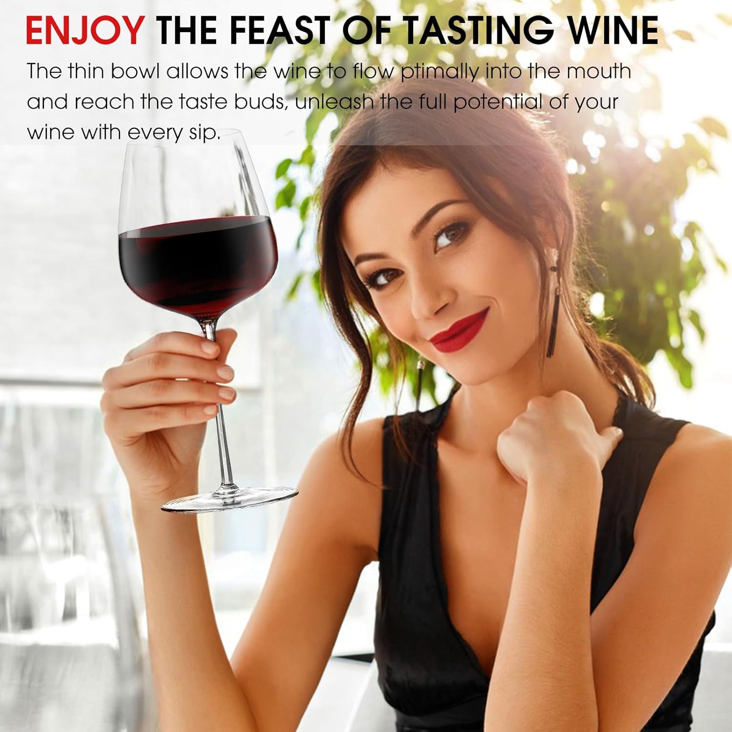 - 【Traditional Hand-Blown Craftsmanship】High-quality wine requires high-quality wine glasses. Each glass is carefully crafted by a master craftsman with over 15 years of experience through more than 25 strict craftsmanship procedures. The classic craftsmanship makes the glass ultra-clear, smooth, and elegant. The wine glasses have an ultra-thinnner edge, cold-cutting, to enhance the perception of quality and flavor of any red wine. Elevate your drinking experience to a new height.