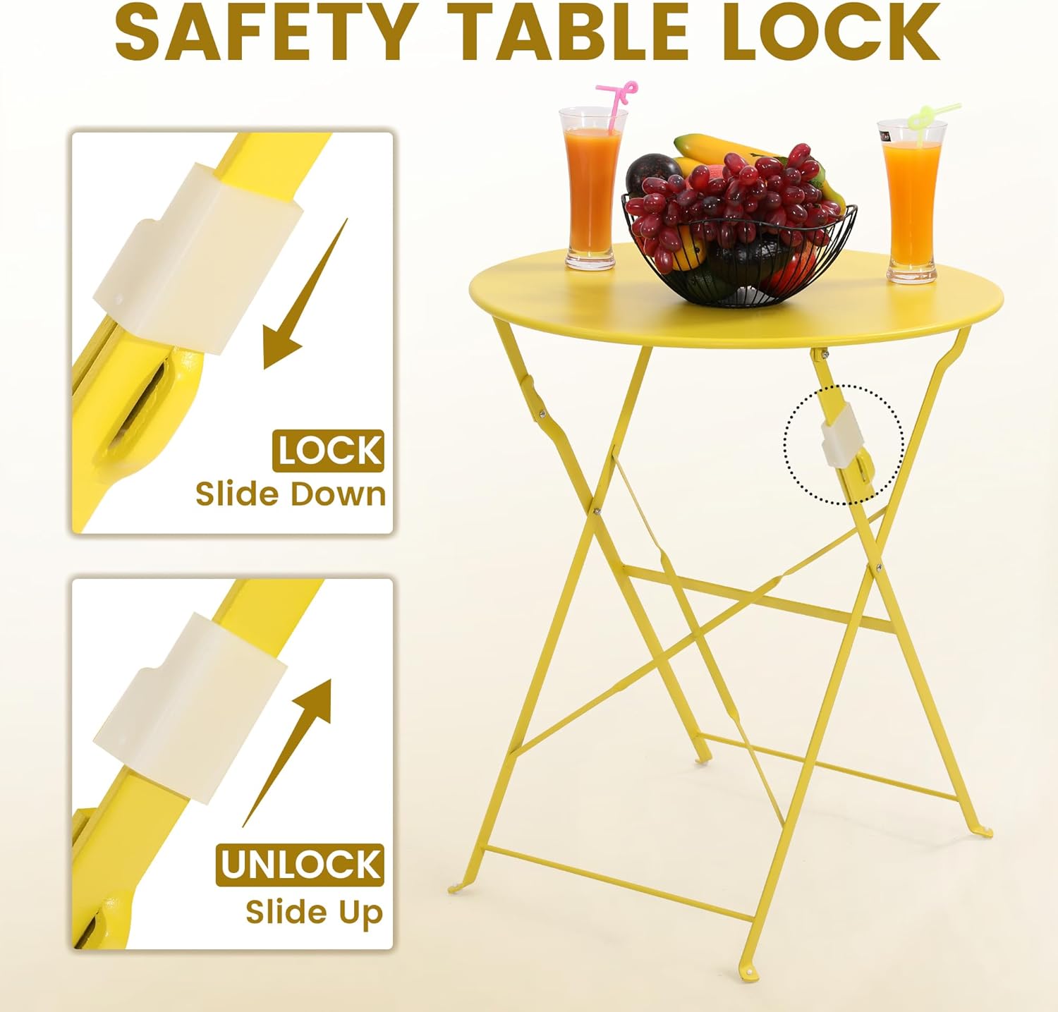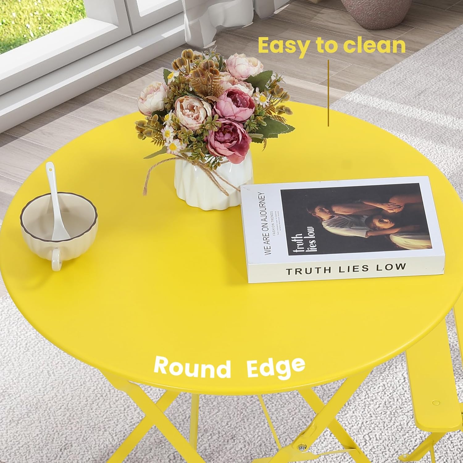 • 【TABLE FEATURES】Each bistro table has a factory pre-installed safety lock to prevent an accidental unfolding . We have added an extra thick curled edge to further enhance the table strength and rigidity, a step which most of our competitors do not do. Cleaning only requires a damp cloth