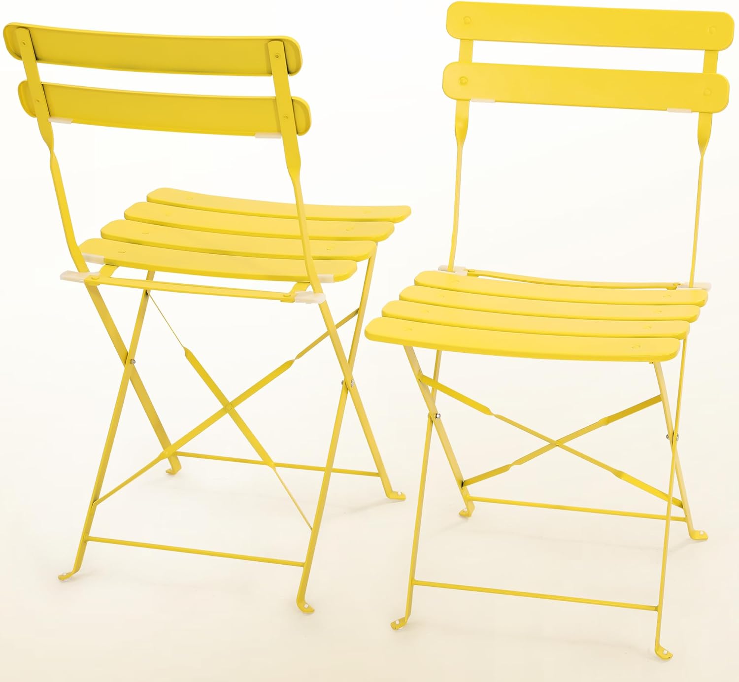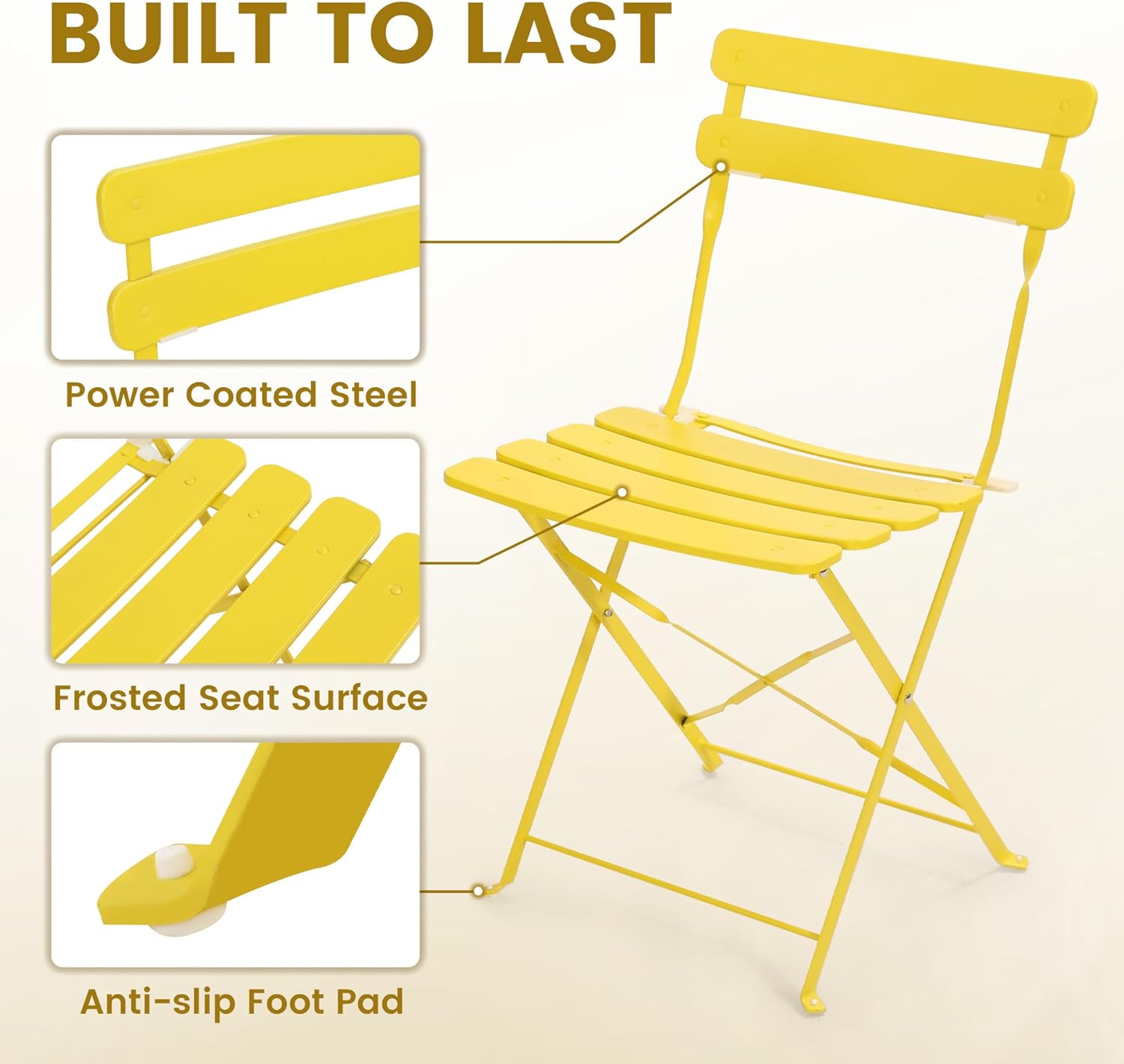 • 【CHAIR FEATURES】Our 3 piece French bistro cafe patio sets are available in 3 vibrant colors; black, yellow, and blue. The 2 folding chairs have been powder coated for a permanent rust resistant all weather finish. The seats have a frosted surface texture to prevent slipping well as anti-slip, anti-scratch foot pads to protect your balcony floor or patio and fold to a small compact dimension when not in use