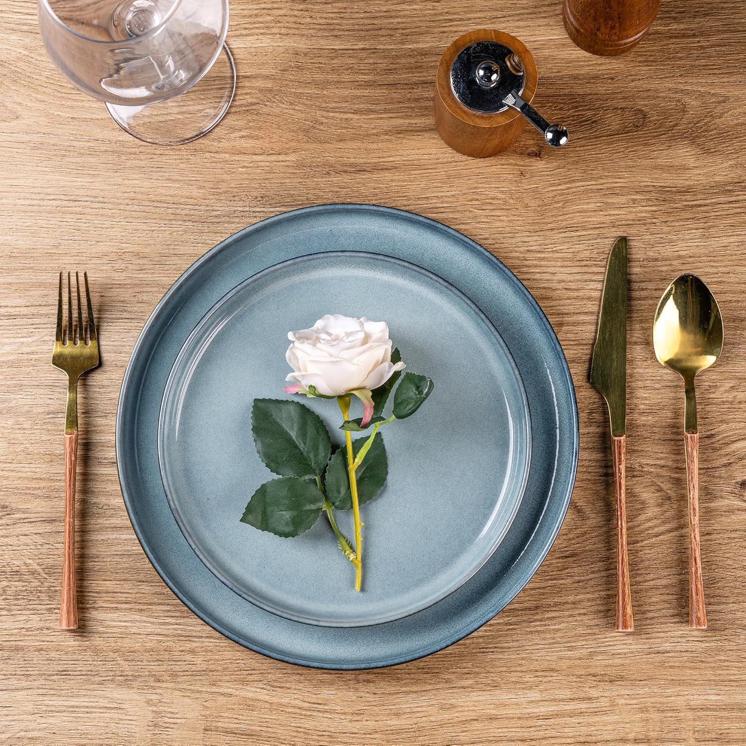 - EVERY PLATE IS UNIQUE: This dinerware set are fired with two different glazes, so the surface develops a beautiful color and makes your food looked even more delicious. The reactive glaze makes every plate unique. Since our glaze is all-natural, it tends to change color depending on the lighting. The color may be a tad different from what you see on your screen, but every item is beautiful.