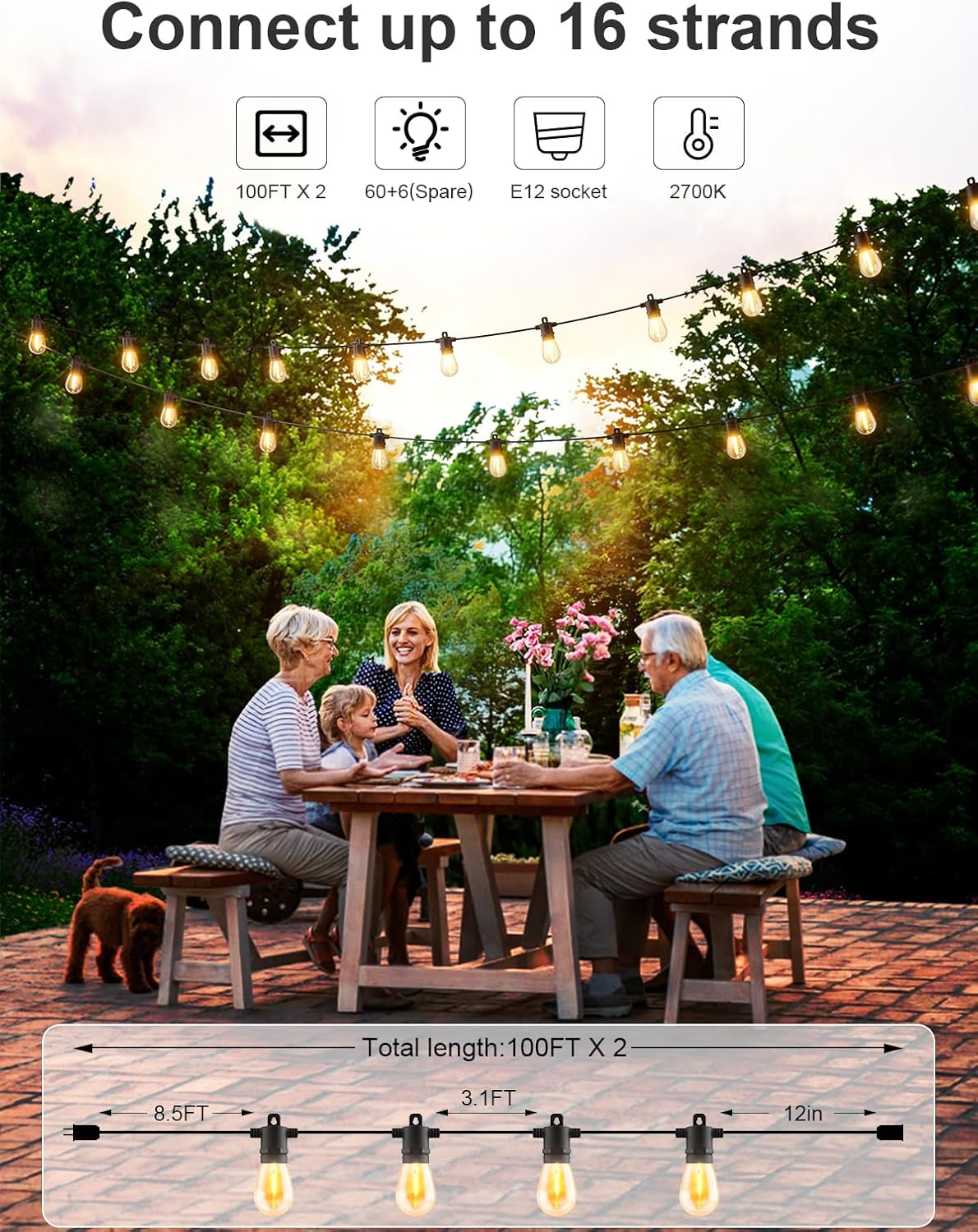 • Wide Application: Perfect for outdoor patio, cafe, bistro, backyard, yard, porch, gazebo, balcony, Outside, garden, party, wedding decoration. Connect up to 16 strands of 100 FT string lights. Please contact us if you have any problem