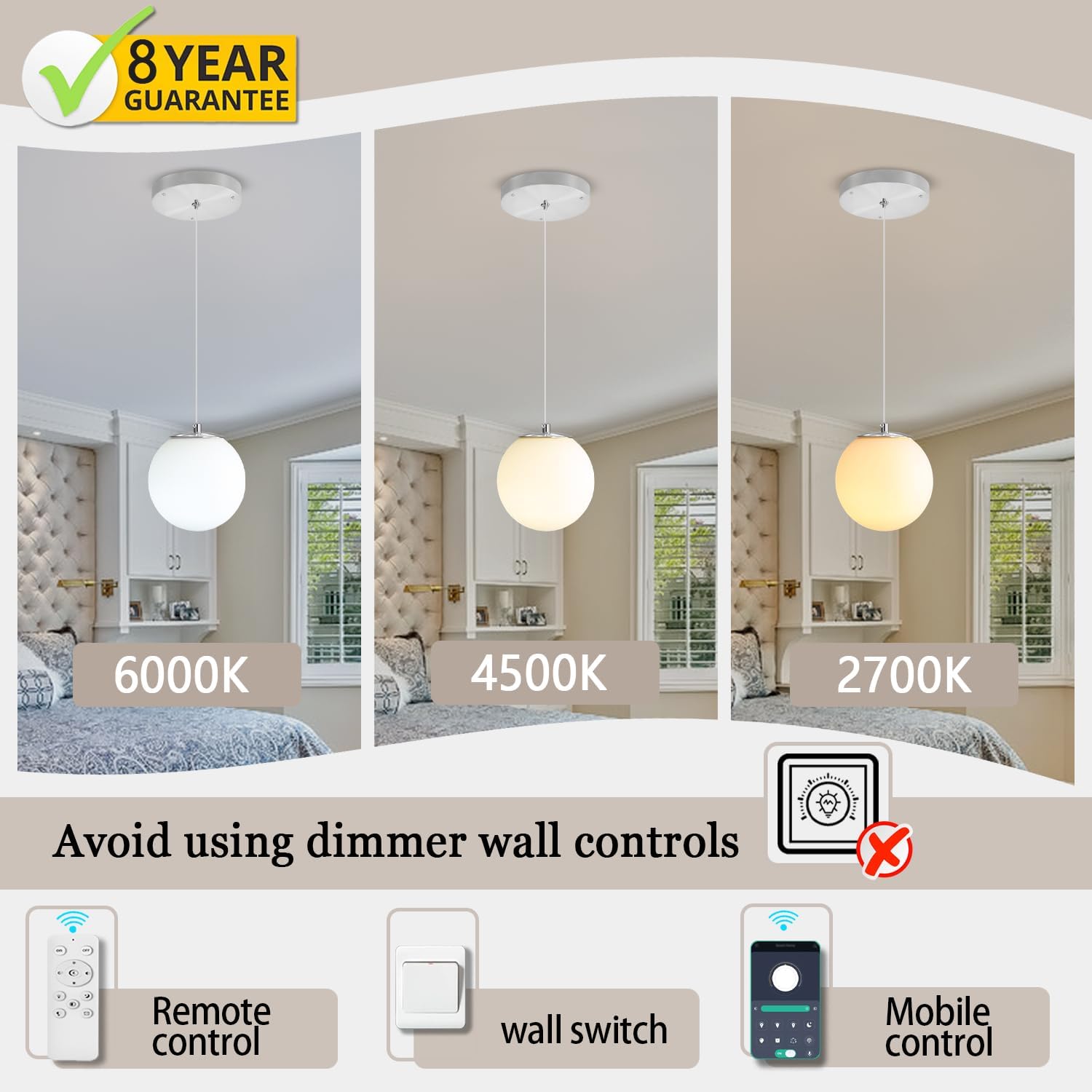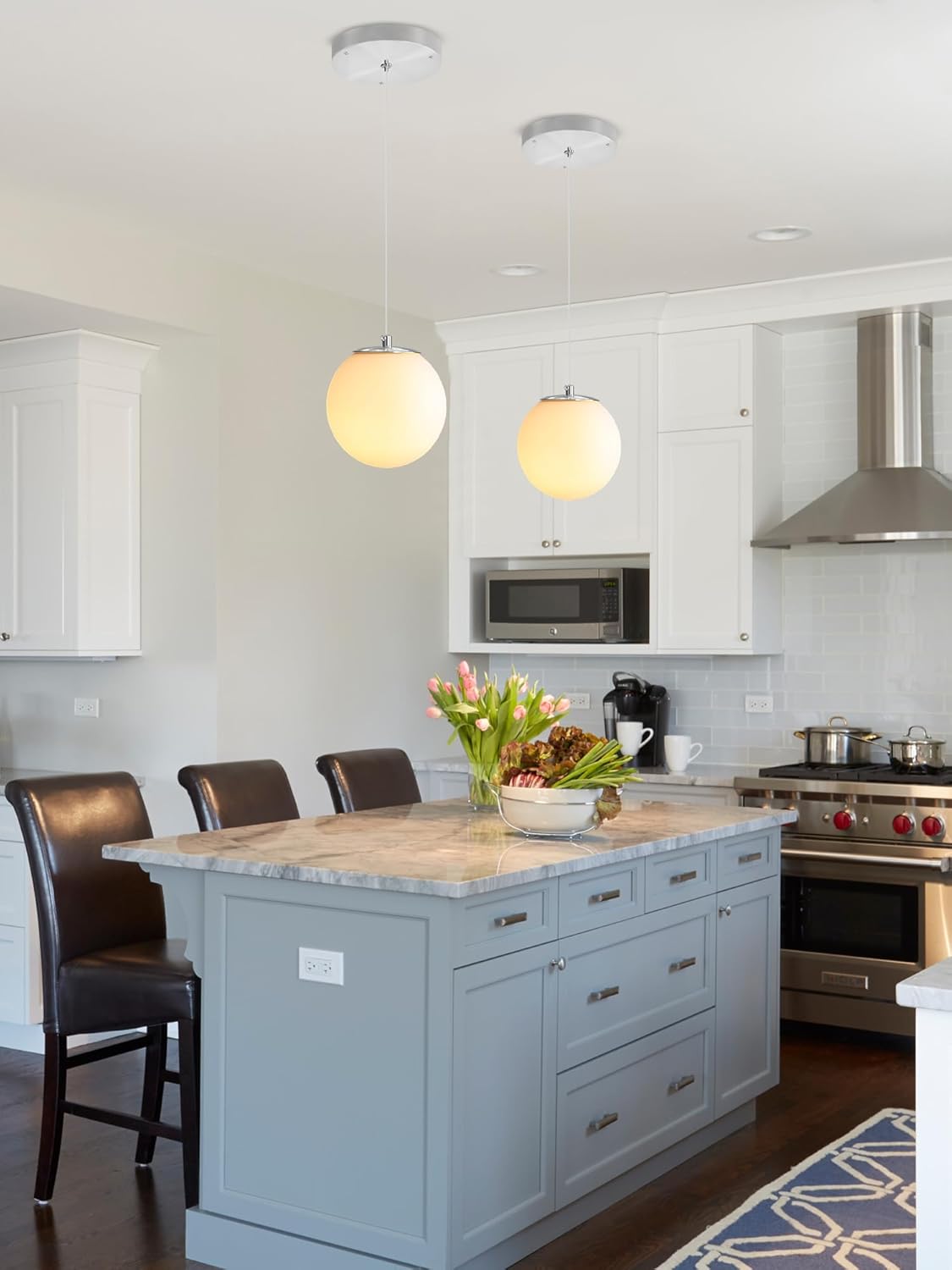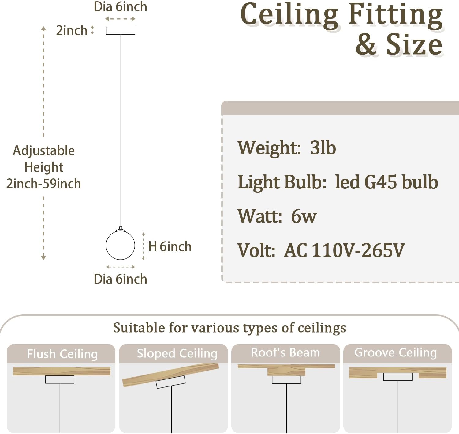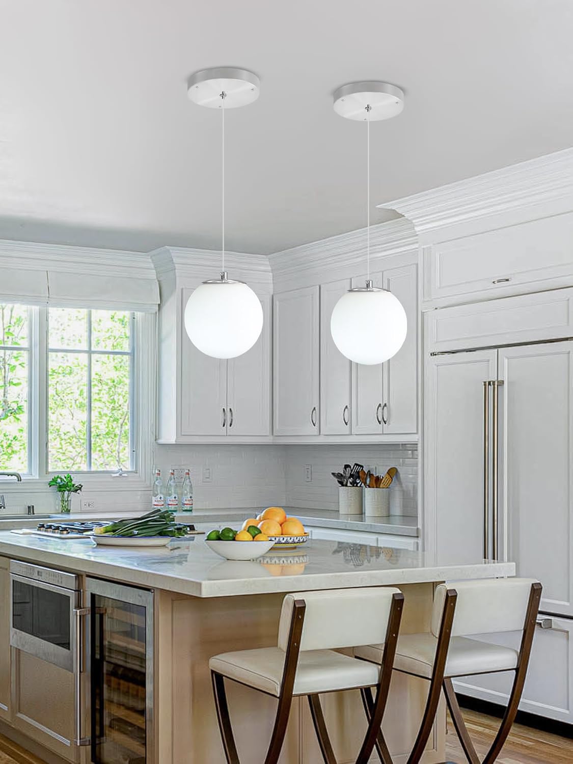 • 【Pendant Light Size】: Made of silver metal and white glass, the pendant light features a silver circular ceiling pan with a diameter of 5.9 inches. The glass lamp shade has a diameter of 5.9 inches. The pendant light has an adjustable cord and a total length of 39.4 inches, allowing you to choose the suitable height for your space.