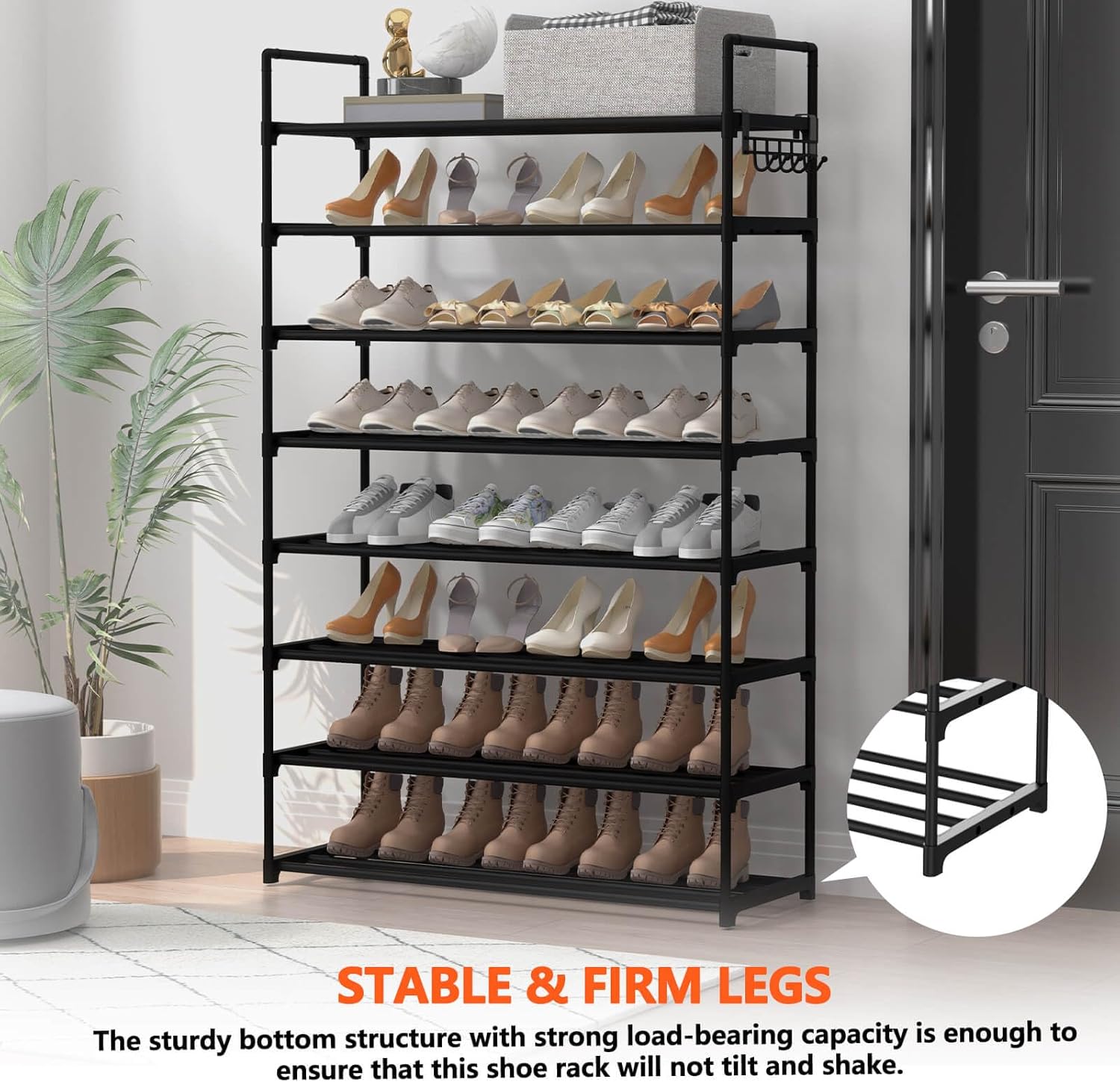 8 Tiers Metal Shoe Rack,Adjustable Shoe Shelf Storage Organizer with Hooks,Stackable Boot & Shoe Storage,for Entryway,Hallway,Closet,Black