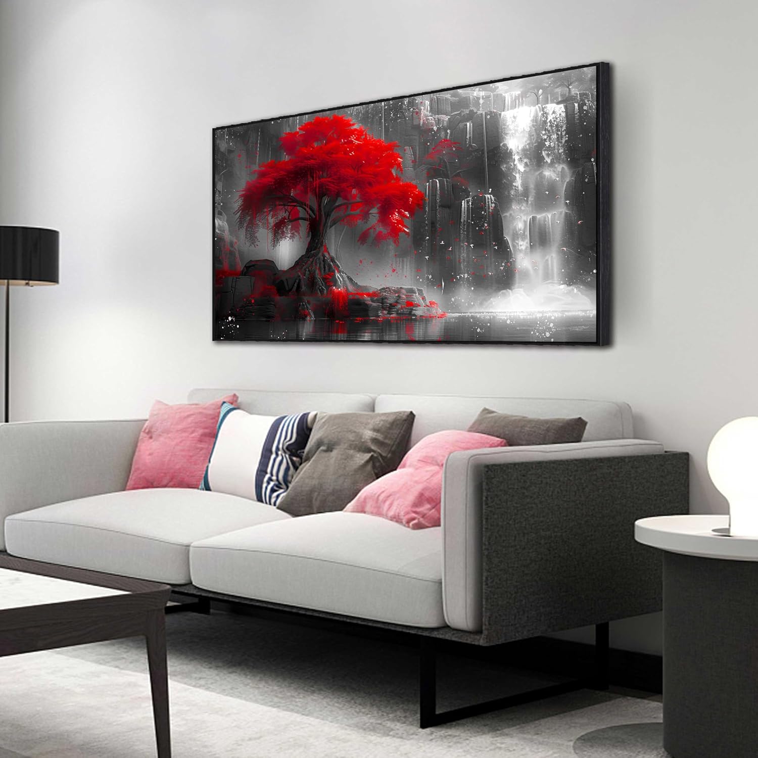 Tree Wall Art for Living Room, Waterfall Wall-Decor for Bedroom, Black White and Red Canvas Print, Large Size 29x59 Inches Framed