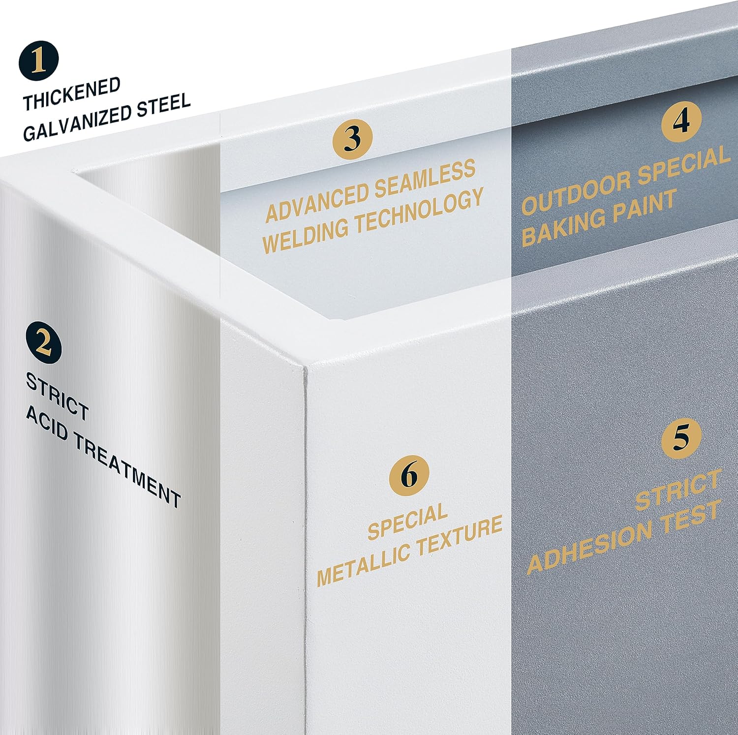 • 【Span Metal Planter】This tall planter box is made from a fully seam welded thick galvanized steel, and adopts outdoor special baking paint, giving the surface a premium metallic color and special texture through the advanced powder injection process.
