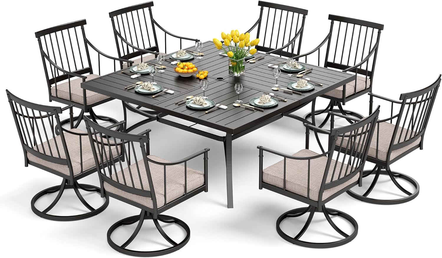 PHI VILLA 9 Pieces Outdoor Dining Table Set for 8, 60” Square Wrought Iron Table & Heavy-Duty Steel Swivel Chairs with Cushions, Large Dining Furniture Set for Patio, Deck, Yard, Porch