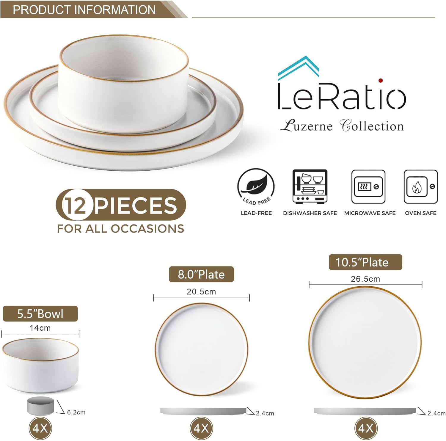 LERATIO Ceramic Dinnerware Sets for 4,Matte Stoneware Plates and Bowls Set, Chip and Crack Resistant | Oven & Dishwasher & Microwave Safe Dishes Set, Service for 4-Dusted Gold Rim
