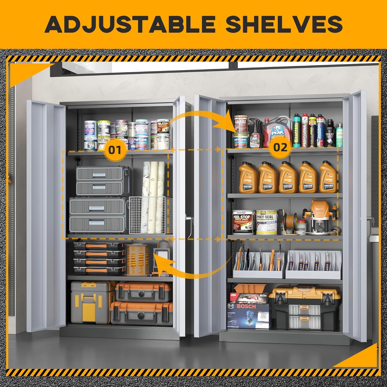- 【Outstanding Quality】Greenvelly have devoted ourselves to the field of metal storage cabinet for more than 20 years, we know how to make excellent metal garage storage cabinet with doors and shelves, so we use cold rolled steel technology and 0.8mm steel plate. We reinforce each cabinet shelves with extra steel bars to prevent the divider from deformation and dents. During frequent use, the garage cabinet can still be in good condition.