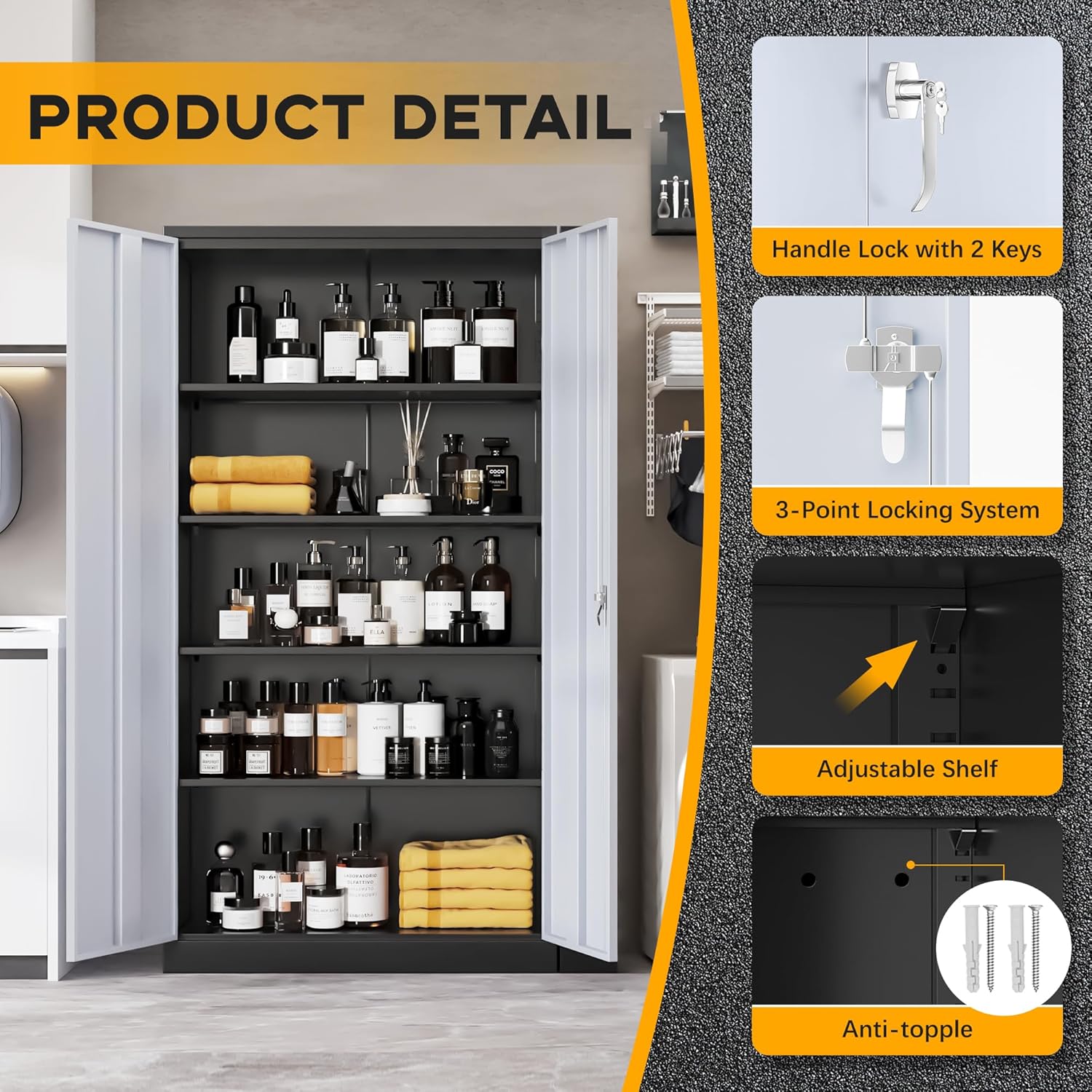 - 【Excellent Security】We have upgraded the locks on the locking file cabinet for better privacy and security of your belongings with a 3-point locking system and 2 keys provided. Both doors are reinforced with extra steel reinforcement. Providing greater security for your valuables and important items, the ability to safely store and access their tools.