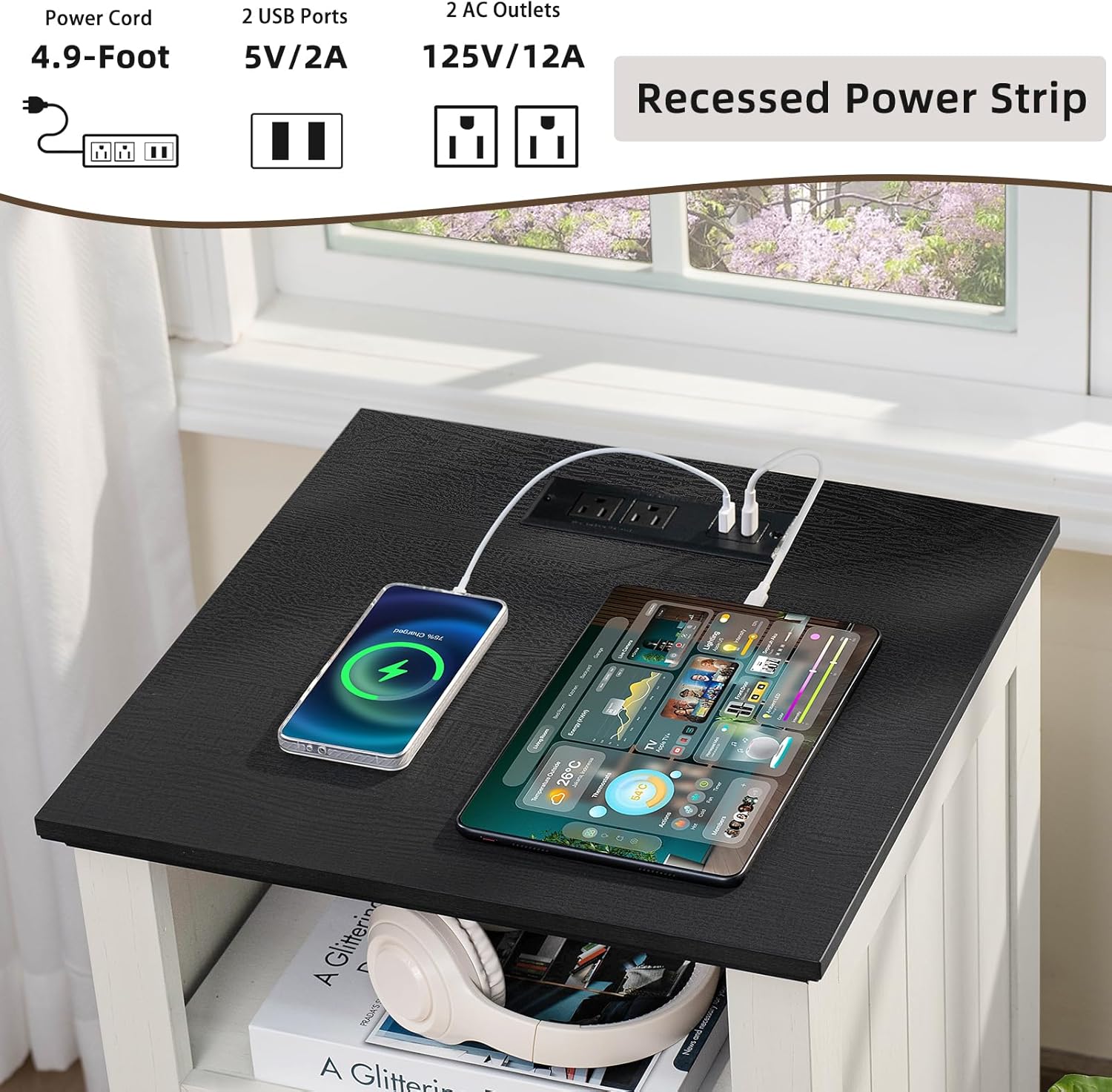 - [End Table with charging station] The side table with storage is equipped with 2 standard AC sockets and 2 USB ports. This tall nightstand provides great convenience when you use electronic devices, keeping your charging devices within reach. A 2.3-inch round hole is designed on the back to facilitate the arrangement