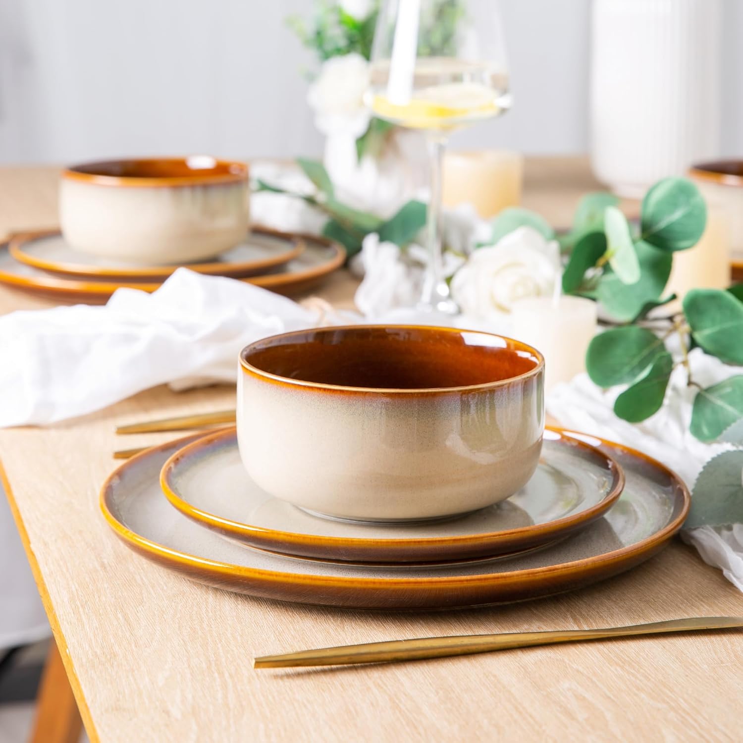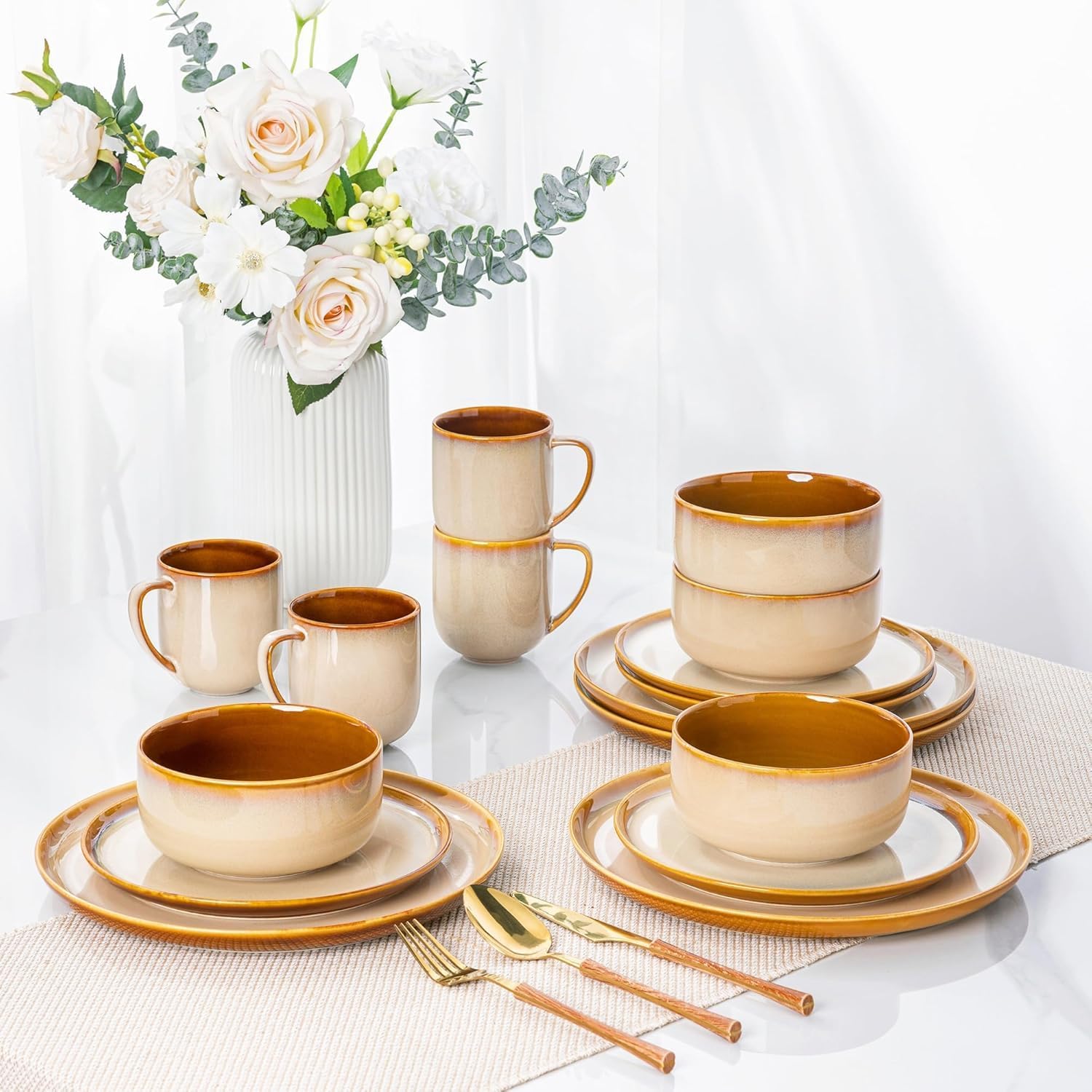 - 【 ELEGANT AND STYLISH DESIGN 】This dinnerware sets leads the dining trend with its expressive colors and finishes. With its vibrant color palette and captivating finishes, it creates an alluring ambiance that exudes warmth. The eye-catching reactive glazes and rich, vivid hues not only soothe the senses but also elevate your dining experience. The generously-sized plates provide ample space for displaying your delectable creations, while their deep bottoms prevent any sauce from spilling over.