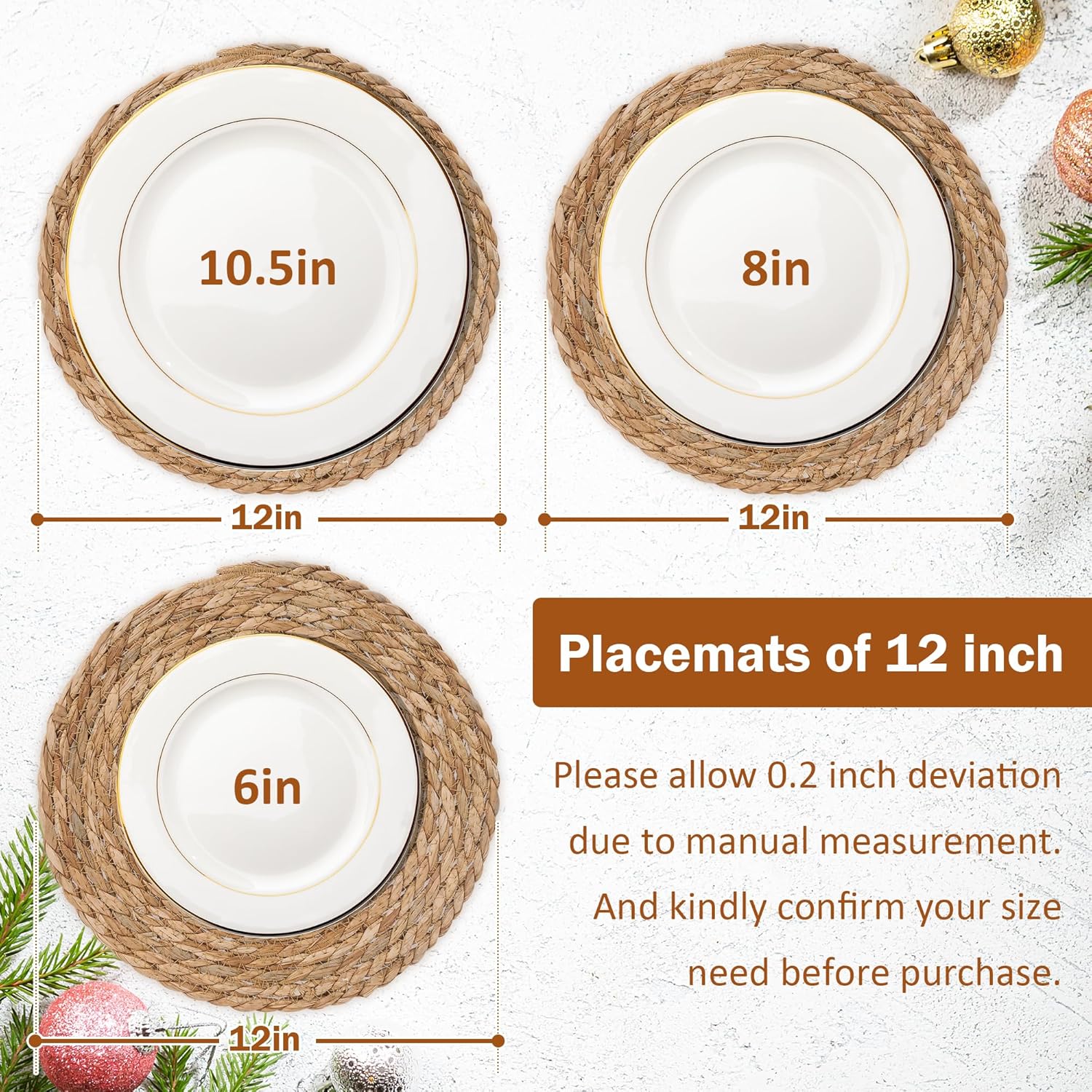 - ✅Generous Different Placemats Sets - Available in a table mats set of 6, set of 8, set of 10, set of 12 with 12inch, 13inch, 13.5inch diameter, designed to fit a variety of dinnerware, these rattan and wicker placemats are large enough to accommodate your plates, bowls, and utensils.