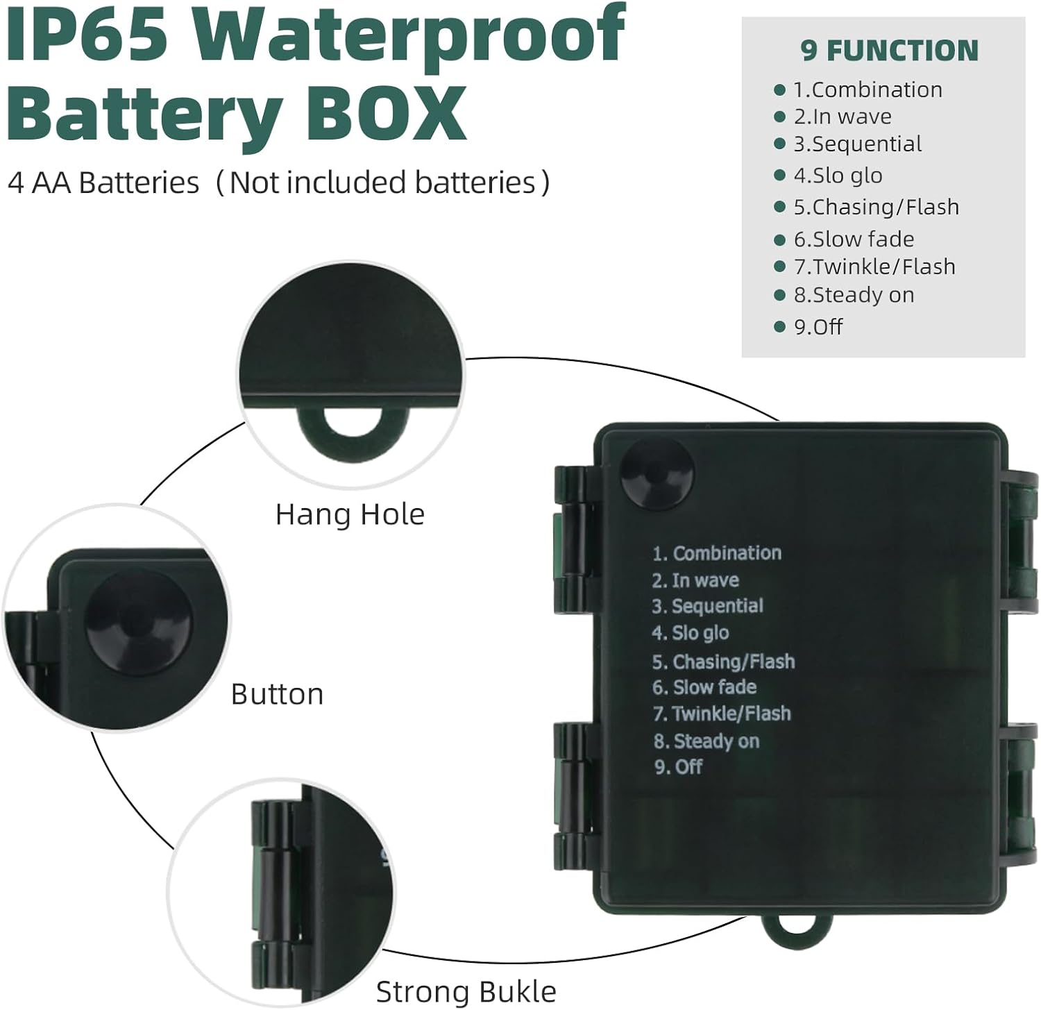 • Christmas Light With 8 Modes Memory Function: Press the Button On The Battery Box To Select The Mode From 8 Options: Combination, In wave, Sequential, Slo glo, Chasing/Flash, Slow fade, Twinkle/Flash, Steady On. Timer And Memory Function Will Be Activated As You Turn The String Lights On, No More Operation Needed