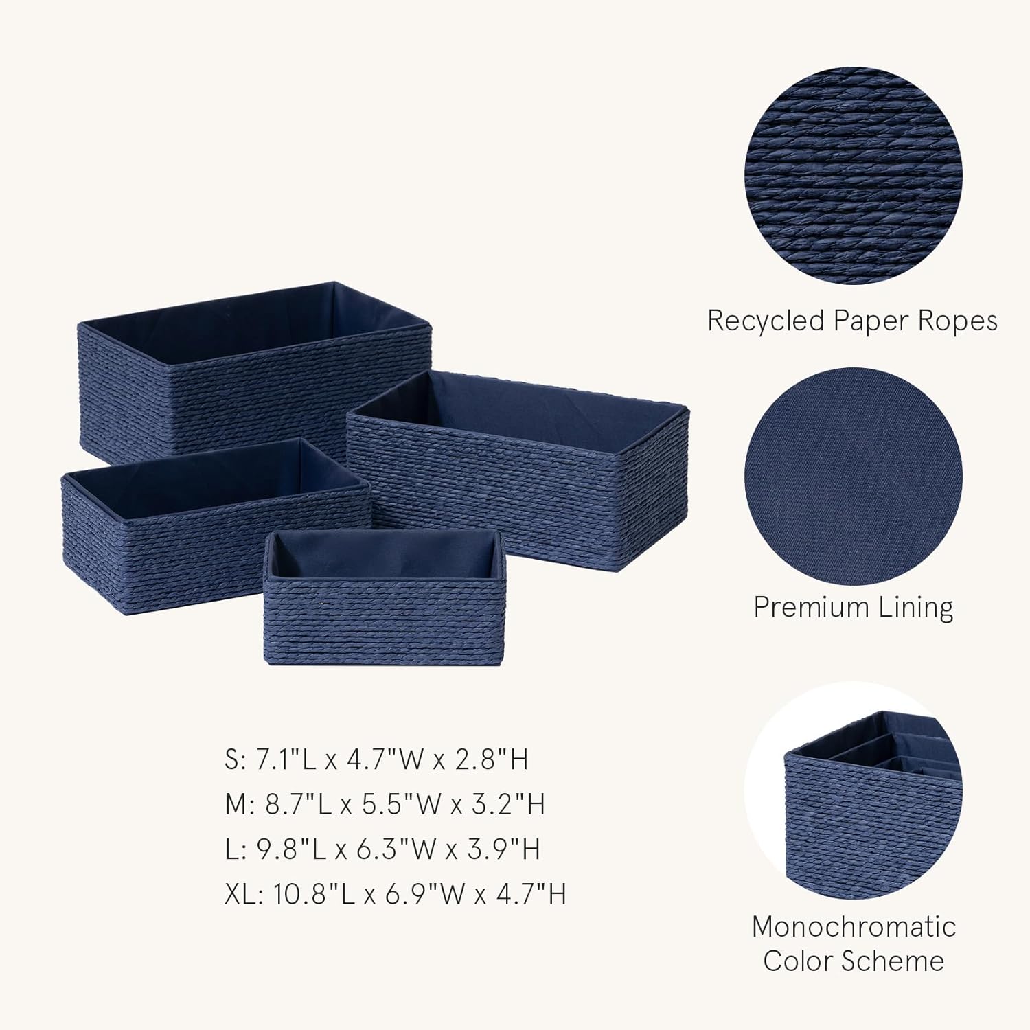 • SIZE & DIMENSIONS: This chic storage box set comes in four sizes to fit your organizational requirements: XL: 10.8" L × 7" W × 4.7" H Large: 9.8" L × 6.3" W × 3.9" H Medium: 8.6" L × 5.5" W × 3.1" H Small: 7" L × 4.7" W × 2.7" H