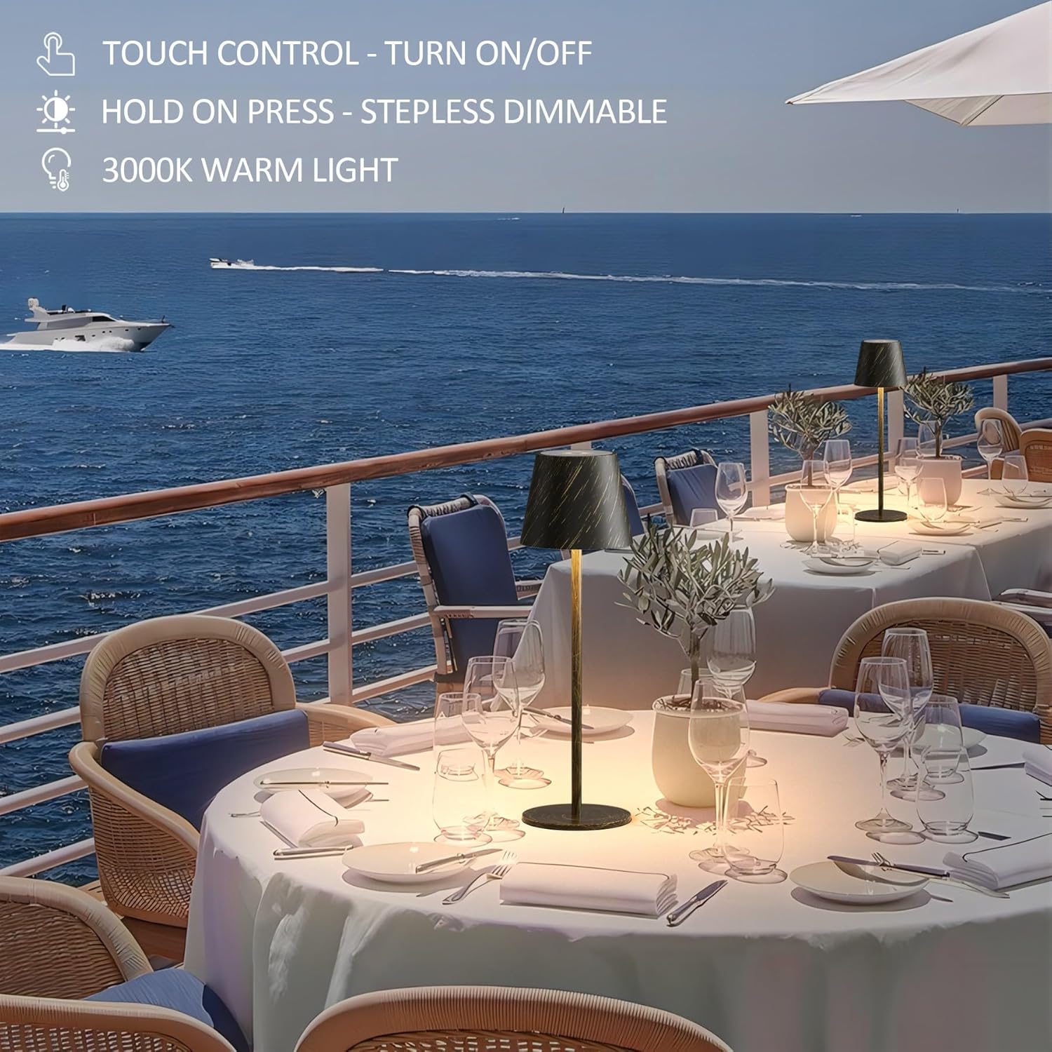 • DIMMABLE DINING LAMP WITH TOUCH CONTROL: LED cordless table lamp owns touch sensor on the top of lamp head. Slightly tap for turning ON or OFF the light. Long press the touch switch to change brightness as you wanted. Brightness has memory function