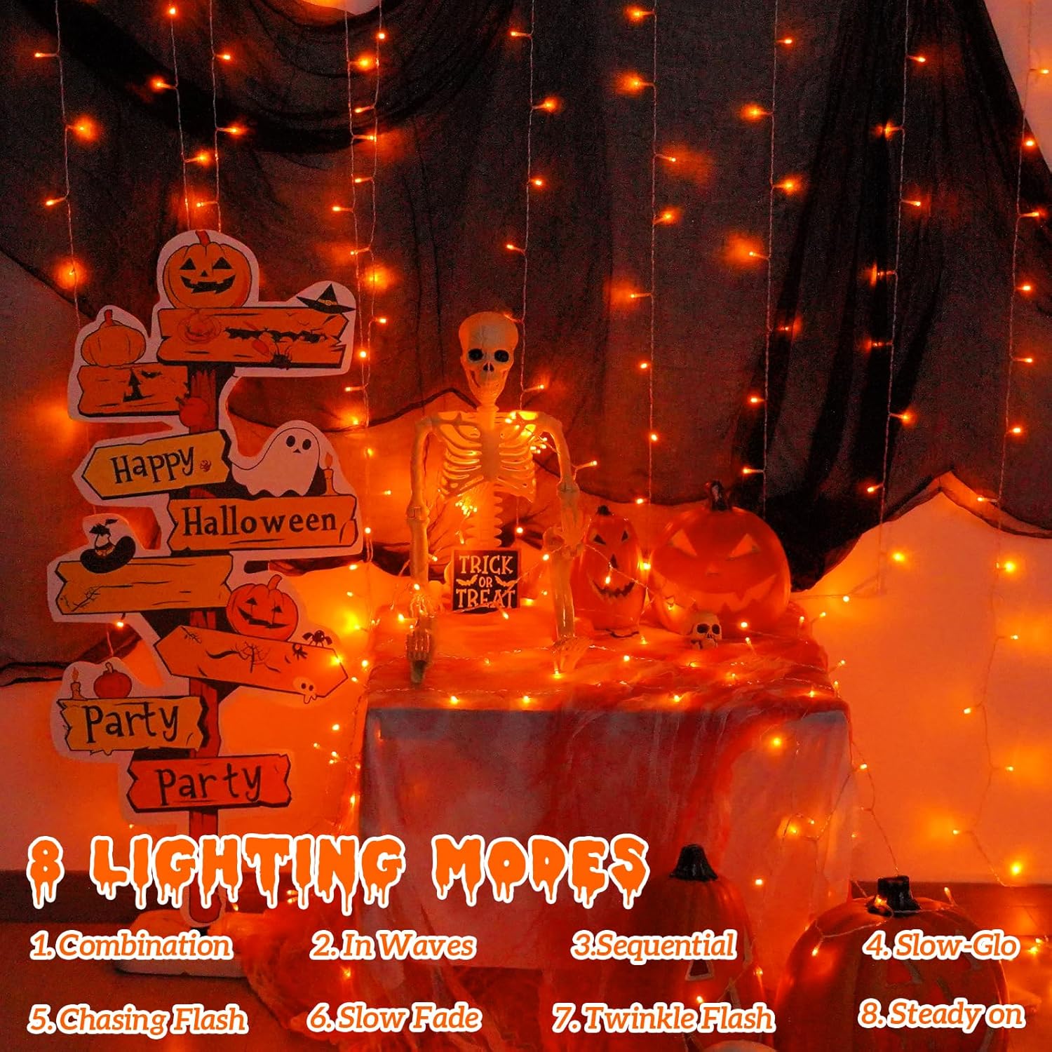 - 8 Lighting Modes: Halloween string lights has 8 lighting modes (combination, in wave, sequential, slo-glo, chase/flash, slow fade, twinkle/flash, steady on). Different lighting effects are controlled by the adapter button. Change the mode as needed to attract and surprise your neighbors! String lights will be a eye-catching decoration at your Halloween holiday.