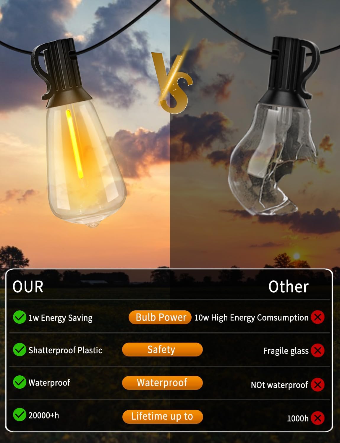 - ENERGY EFFICIENT OUTDOOR STRING LIGHTS: 50ft Extra-long outside lights for yard are equipped with our upgraded wires and 25+2 ST38 shatterproof vintage bulbs. The outside lights for patio with 1W Led ST38 bulbs reduce your 90% electricity bills, compared to incandescent bulbs. The outdoor hanging lights boasting an incredible lifespan of up to 30,000 hours.