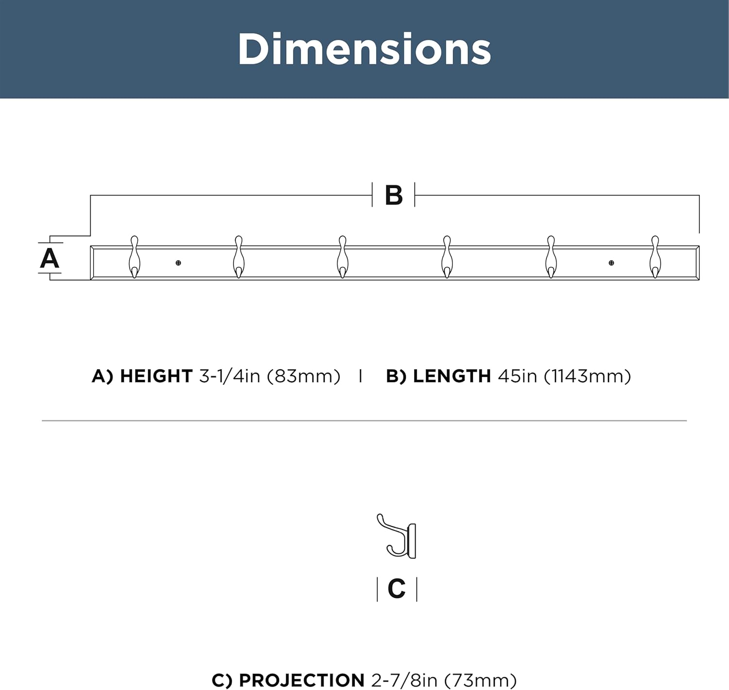 • DIMENSIONS: Hook rack measures 3.26"H x 45"L x 2.82"D