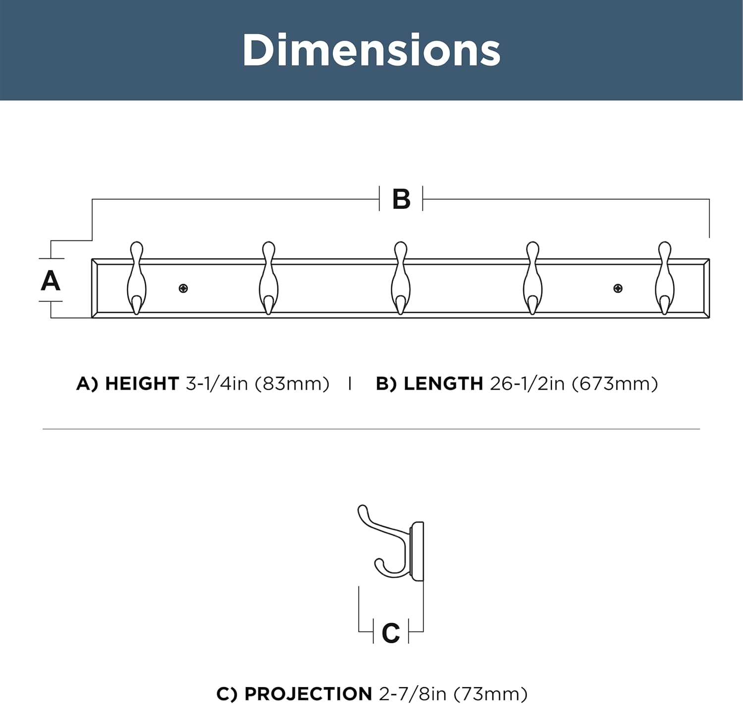 • DIMENSIONS: Hook rack measures 3.26"H x 26.51"L x 2.82"D