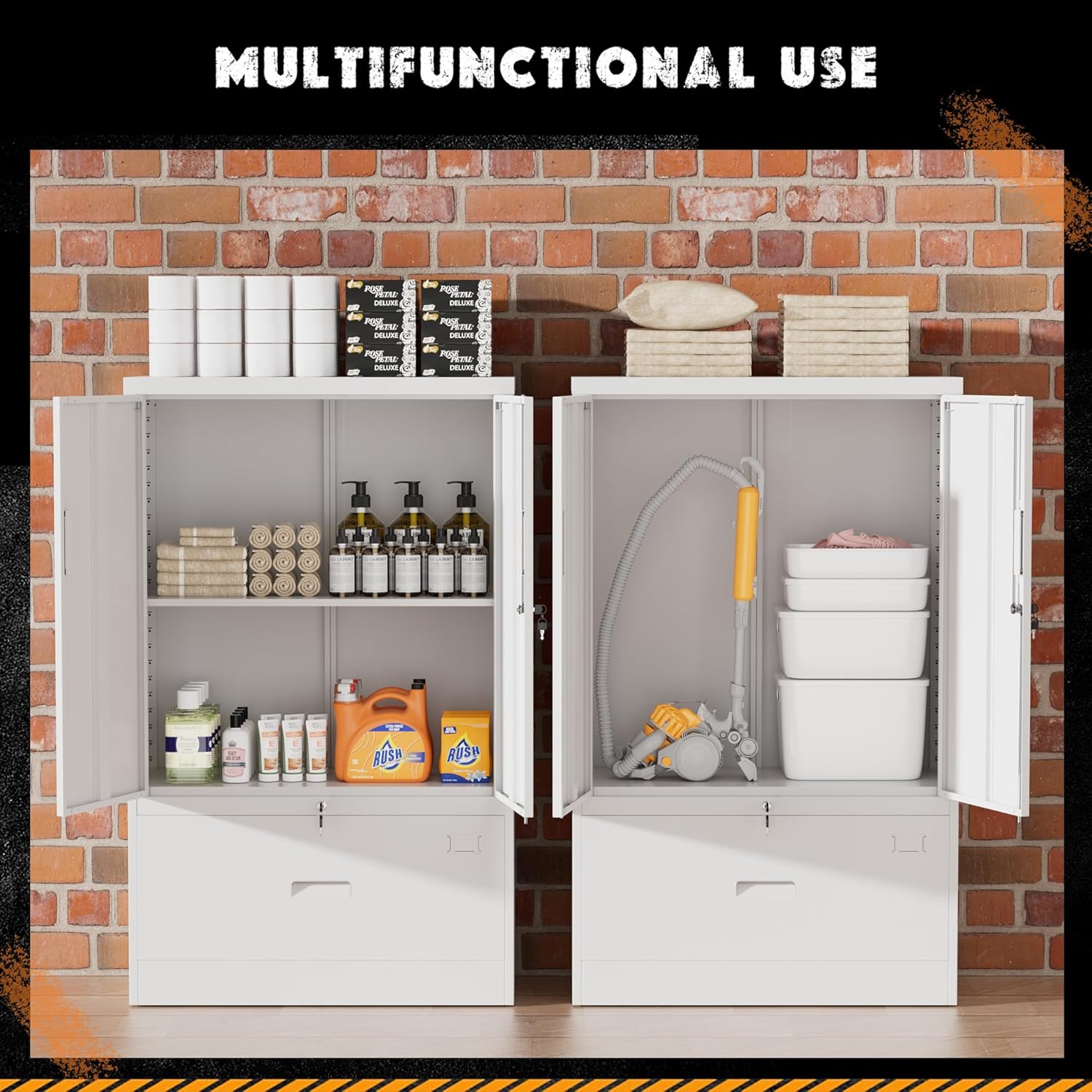 - [Modern&Locking Design]:Greenvelly steel storage cabinets use the concept of simple design, the up cabinet design uses a 3-point lock system, which further improves privacy. The down drawer is also equipped with a locking device, we also designed a card box to facilitate your storage of the distinction.Meanwhile, we provide 4 keys, the lock block is designed to effectively protect your various valuable documents and belongings