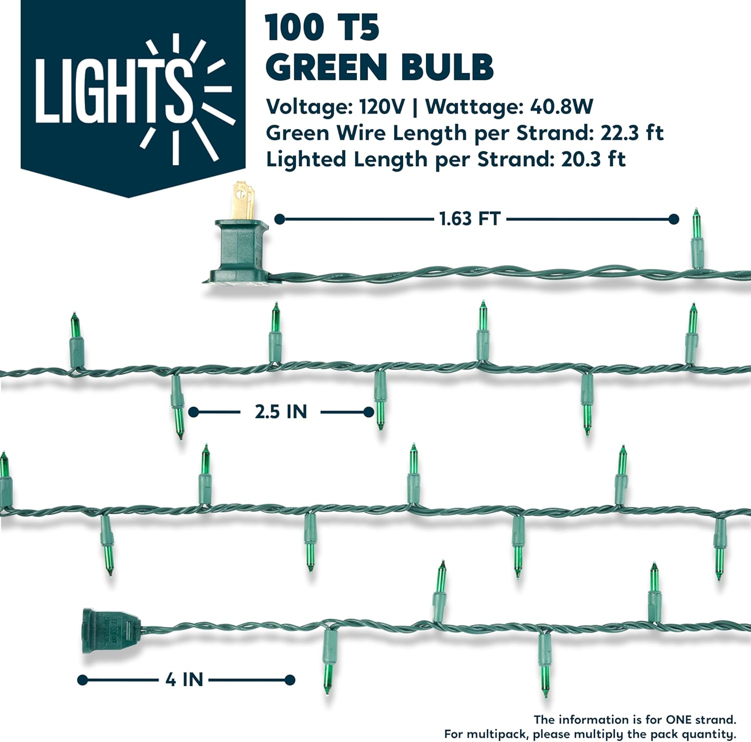 • SUPER VALUE PACK. Our Christmas String Lights has a total of 100 Christmas Lights, Green T5 Bulbs with Green Wire. 40.8W 120V. Total Lighted Length is 20.3 Feet. Total Wired Length is 22.3 Feet. Bulb Spacing 2.5 inches. High Voltage. Come with 4 extra bulbs & 2 replacement fuses
