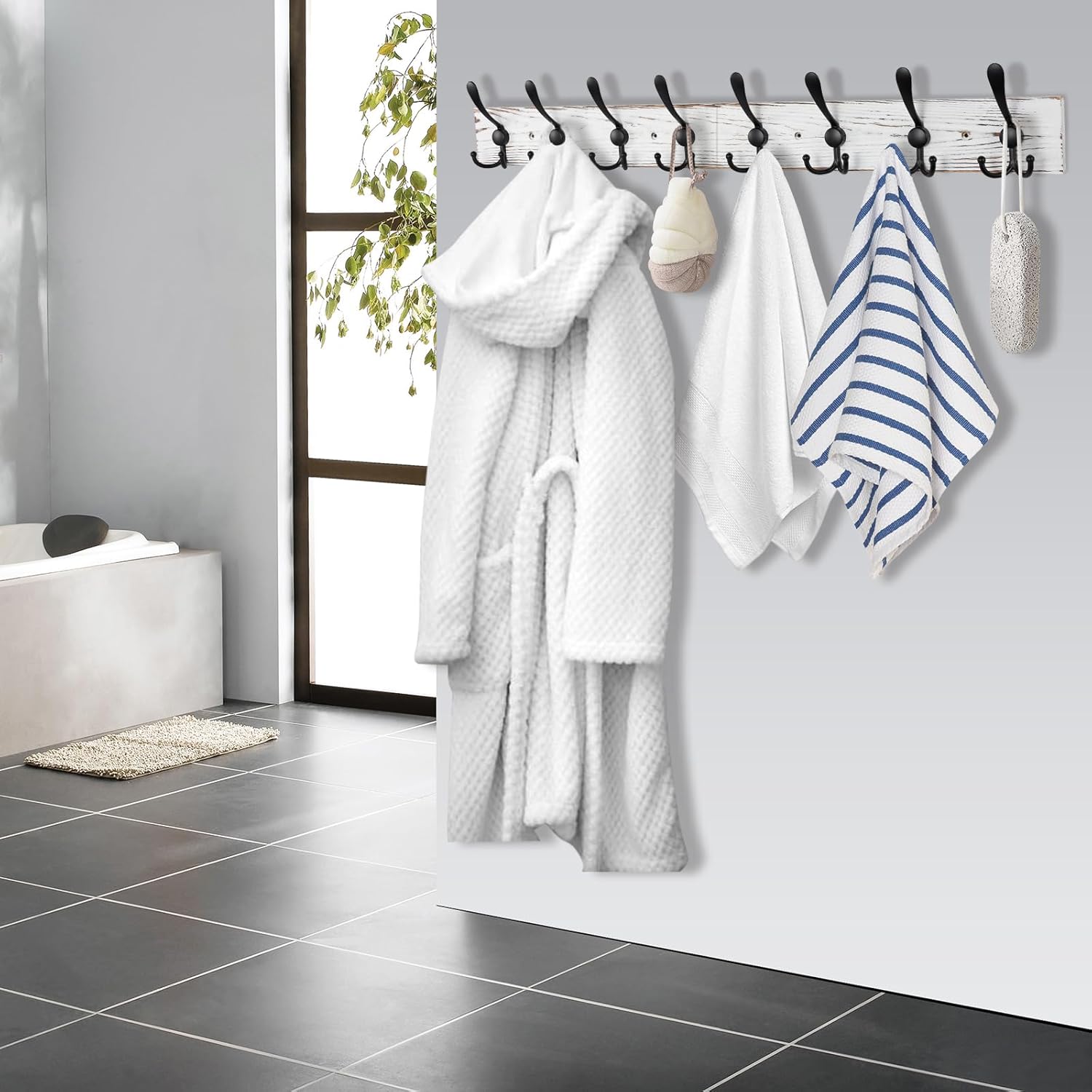 • [Package & Size]: PACKAGE: 1 x old white pine plank, 8 x black triple-hooks, 16 x short screws, 4 x long screws, 4 x drywall anchors, 1 x installation instruction. SIZE: 32.2'' (L) x 4.7'' (W) x 2.9'' (Thick).
