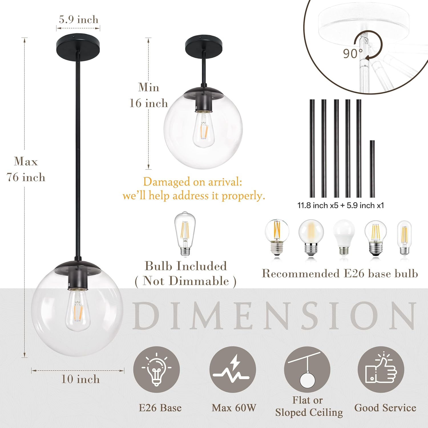 • [ Bulb Included ] This black clear globe pendant light comes with a ST64 bulb, convenient for you not to buy extra bulbs, bulb max power 60W, 110-120V AC hardwired. Fully dimmable when used with dimmable bulb and dimmer switch.