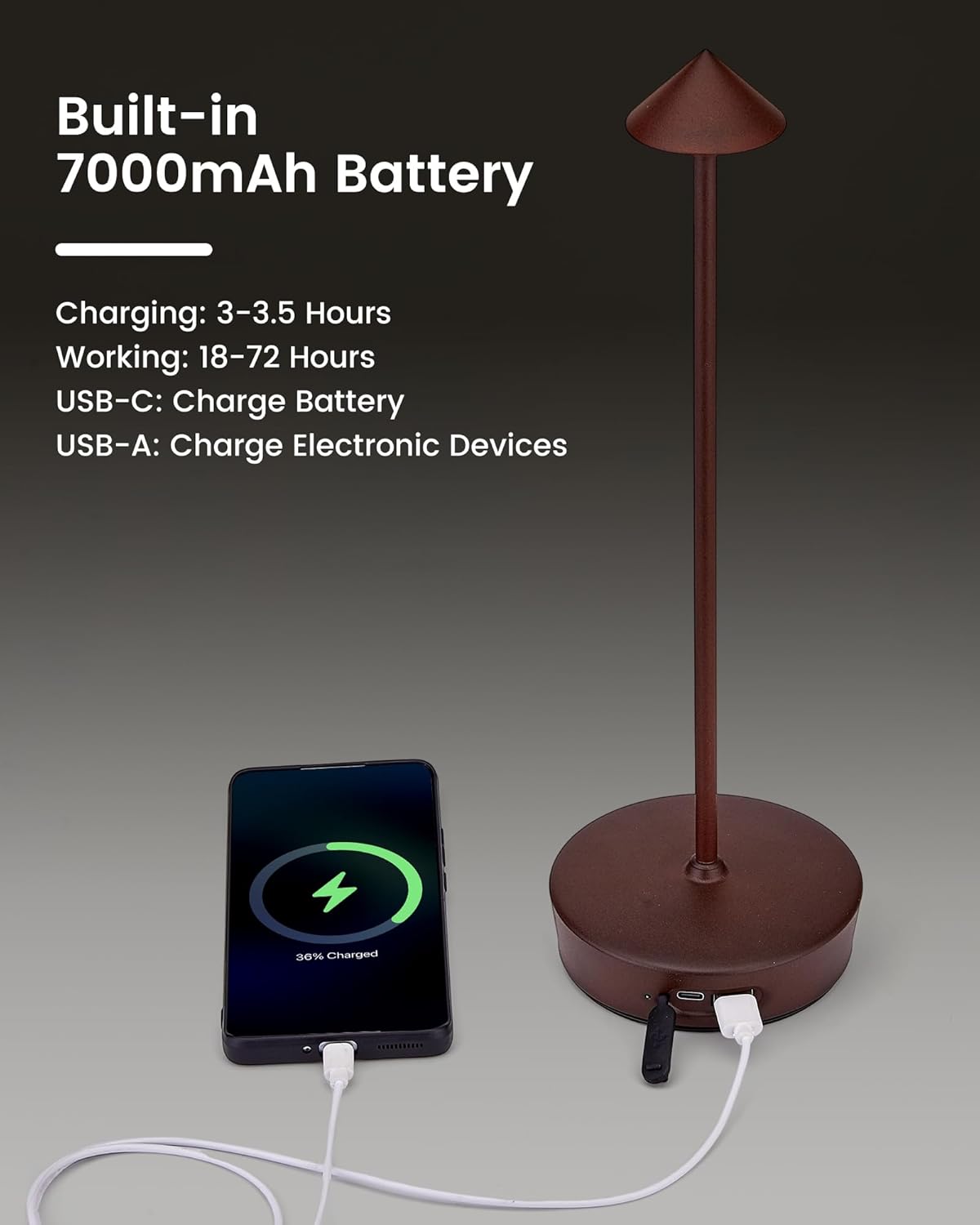 - 【Cordless Table Lamp Rechargeable】As adopt a safe and durable 7000mAh rechargeable lithium-ion battery, it can be used up to 18-72 hours as long as fully charged with 3-3.5 hours in advance. You can easily charge the battery by using the attached USB-C cable, The red light is flashing when it is charging; the green light is always on when it is fully charged.