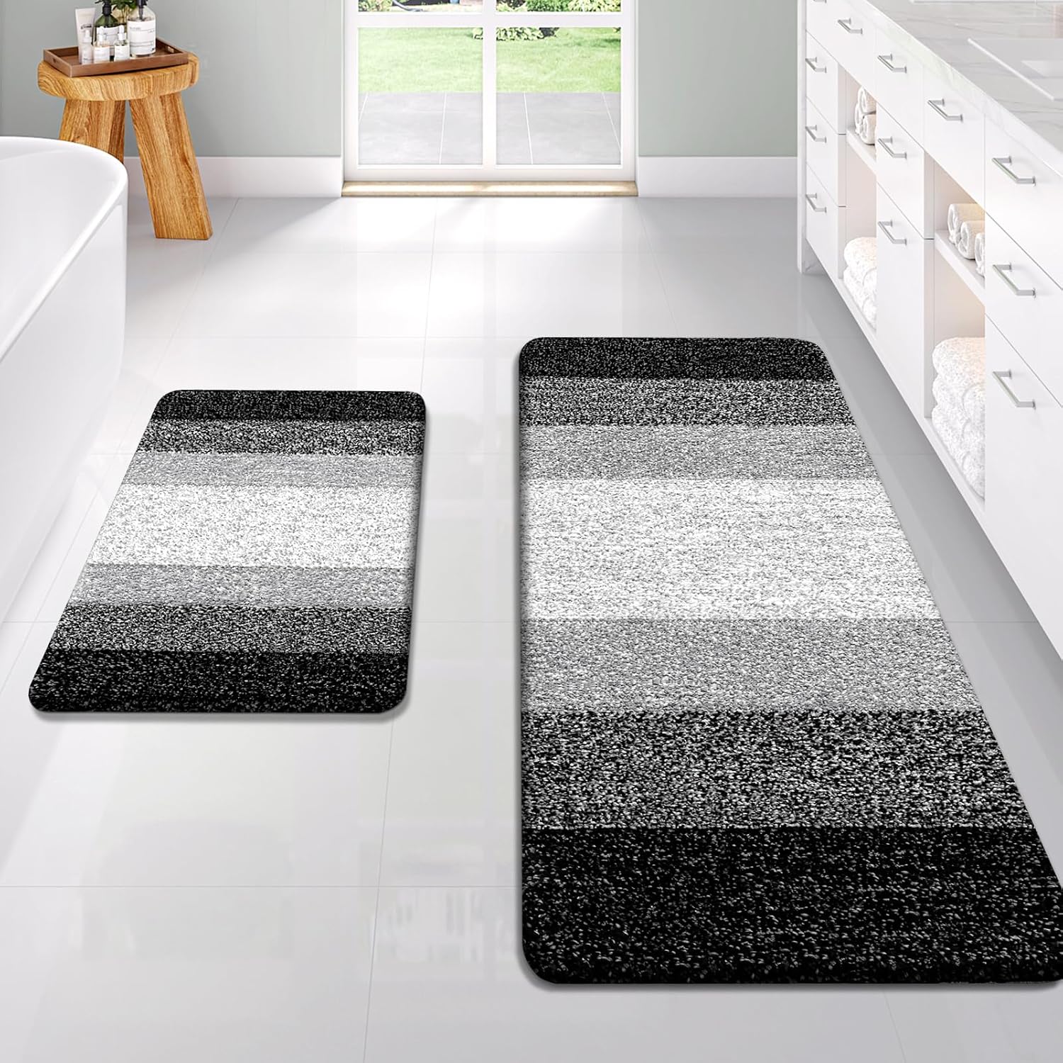 • [Beautiful Décor & Multipurpose] The bath rugs have unique geometric design, to provide beautiful décor to nearly any space in your bathroom. The mats work perfectly in front of your single or double sink, shower, bathtub or anywhere you want to have support and warmth to your feet.