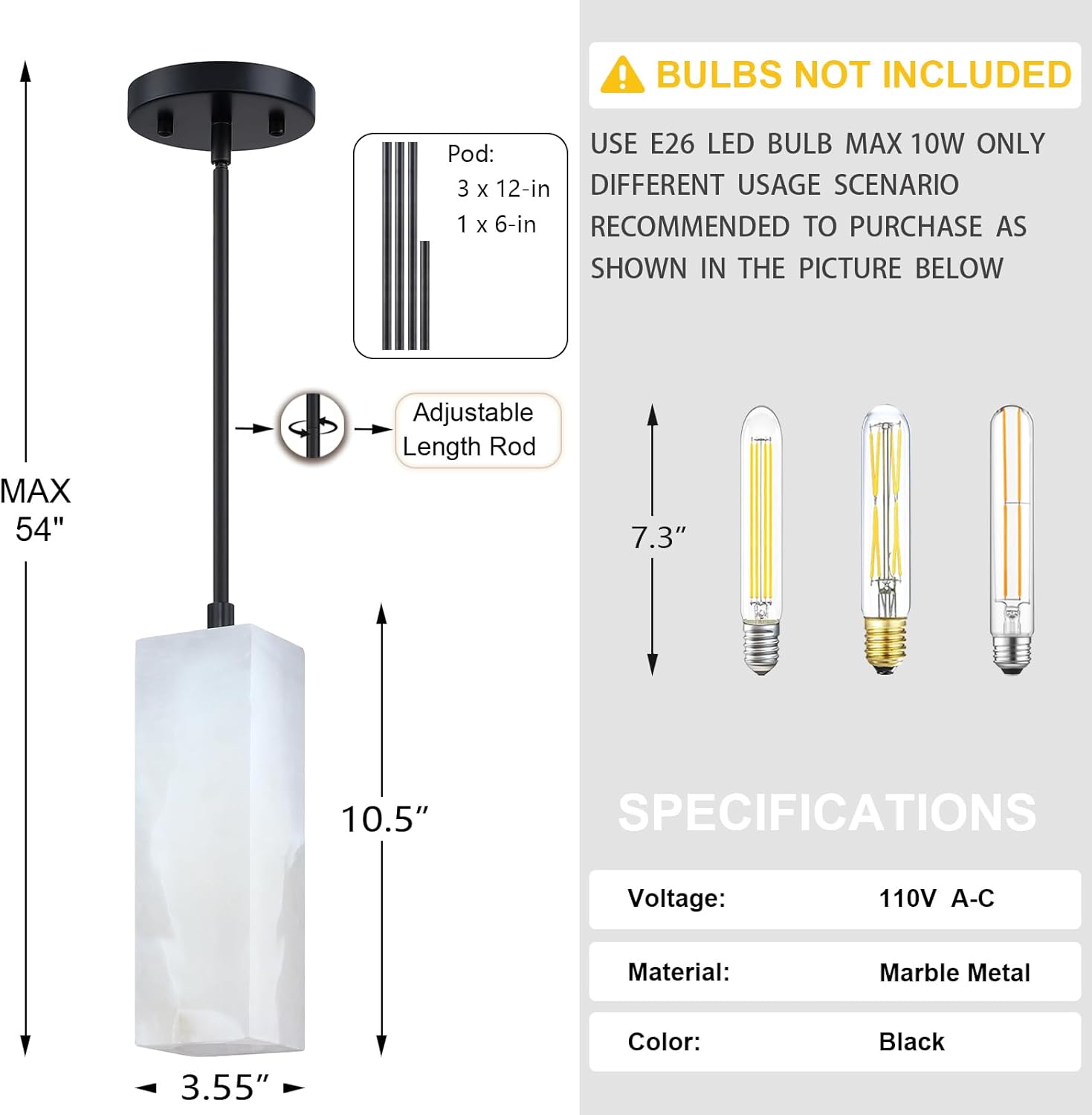 • 2.UL Certification Marble Pendant light size: H54"*W3.55.The length is adjusted by rod and can be installed on sloped, vaulted or flush ceilings.